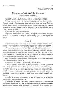 Руслана СТЕГУРА 35 Руслана СТЕГУРА Дневник одной чуднОй девочки (журнальный вариант) Привет! Меня зовут Полина и мне уже целых 10 лет. Я подумала о том, что я в самом расцвете сил (как мой лю бимый герой - Карлсон) и пора начать писать о себе биогра фию, ведь я знаю, что я обязательно стану знаменитой. Нужно начинать прямо сейчас, чтобы не упустить ни малейшей дета ли из моей судьбы. В общем вот. Дни моей жизни. Заранее извиняюсь за слова, которые написаны не пра вильно. Я еще только в третьем классе учусь, не все правила знаю. Глава 1. Стрелка будильника еще не дошла к девяти часам утра, когда я лениво открыла глаз от очередного маминого вопля. «Полина, уже девятый час! Быстро собираться в школу» - мама рывком распахнула плотные шторы, и в комнату ворвал ся озорной солнечный зайчик (точнее, это был просто гигант ский зайчище, потому как он залил светом всю мою комнату и заставил меня невольно зажмуриться). «Ну, маааам» - недовольно протянула я и плотнее заверну лась в одеяловый кокон.я «Полиныч, ты чего? - в комнату зашел отец. - Ясно, опять всю ночь книжку читала, - мама достала из - под кровати «Тома Сойера» и положила на тумбочку. - Виталик забери у нее фонарь. Зачем ты ей его вообще пода рил? - мама уставилась на отца, держа в руках мой фонарик, который папа мне вручил за отличное окончание второй чет верти. «Чтобы я читала по ночам» - хитро ответила я, и, встав с постели, пошла умывается. В зеркале на меня смотрела сонная девчушка, с зелеными глазами и курносым носом. Я показала язык своему отражению и принялась расчесывать свои длинные густые пшеничного цве