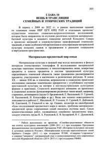 395 ГЛАВА 10 ВЕЩЬ В ТРАНСЛЯЦИИ СЕМЕЙНЫХ И ЭТНИЧЕСКИХ ТРАДИЦИЙ В период с 2008 по 2022 гг. в рамках выполнения заданий по плановым темам НИР ЦГП КНЦ РАН и отдельным проектам1 осуществлен комплекс социально-антропологических исследований, которые были направлены на изучение различных аспектов материально­ бытовой культуры и вещевого поведения жителей Кольского Севера в процессах миграций и социокультурных трансформаций этнических традиций, а также особенностей презентации и популяризации материальной культуры кольских саамов и продвижения в реальном социальном и виртуальном пространствах. Материально-предметный мир семьи Материальная культура и вещный мир всегда находились в фокусе интересов отечественных этнографов. В исследованиях материальной культуры тщательно описывались и типологизировались вещи, конкретные предметы и классы предметов в системе традиционной культуры определённого этнической общности, также традиционно рассматриваются предметы, участвующие в магических и религиозных ритуалах. В конце XX — начале XXI вв. в этнологии, антропологии и социологии происходит постепенное смещение тематических приоритетов с углублённого изучения крестьянской культуры на интерес к постиндустриальным культурным формам и практикам. Социологи акцентируют внимание на временных и социальных аспектах функционирования различных типов вещей, например, старинных, антиквариата (труды О. Бредниковой, Е. Васильевой, О. Гуровой, Н. Касенковой, И. Копытоффа и др.). Вещь как элемент повседневности описывается в работах С. Махлиной, И. Утехина, О. Гуровой, Е. Дейхиной, М. Елютиной, О. Ечевской и мн. др. Однако, несмотря на своеобразный «бум» исследований предметного мира и «вещи», проблемы материально­ предметной среды современных семей оказались изучены мало. Среди немногочисленных работ, посвящённых семейному предметному миру, следует отметить труды И. А. Разумовой, Е. В. Бусыревой, Н. С. Душаковой, 1 Работа выполнялась по проектам: «Семейно-родственные общности как агенты культурных инноваций» (2009-2011 гг.) при поддержке Программы фундаментальных исследований Президиума РАН «Историко-культурное наследие и духовные ценности России»; «Мемориальная культура переселенческих семей Крайнего Севера» (2012 г.) при поддержке РГНФ; «Северяне-“старожилы” и северяне-“мигранты”: миграционный опыт и коммуникационные сети современных жителей Мурманской области» (2014-2015 гг.) при поддержке РФФИ.