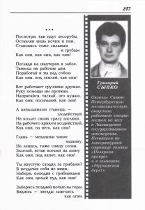 * * * Посмотри, как идут лесорубы, Оставляя лишь кочки и пни. Становись тоже сильным и грубым Как они, как они, как они! Погляди на шахтеров в забое. Тяжелы их рабочие дни. Поработай и ты над собою Как они, под землей, как они! Вот работают грузчики дружно. Руку помощи им протяни. Напрягайся, таскай, это нужно. Как они, посильней, как они! А начальником станешь — злодействуй На коллег своих сразу взгляни. На рабочего криком воздействуй, Как они, на него, как они! Глянь — механики чинят машину. Не ленись, тоже спину согни. Залезай, встав ногами на шину Как они, под капот, как они! Ты впустую сходил за грибами? В неудачах себя не вини. Набери, походив с грибниками Как они, целый пуд, как они! Заберись поздней ночью на горы. Видишь — звезды зажглись как огни. Окончил Санкт- Петербургскую лесотехническую академию, работает специа листом по лесу в Лапландском государственном заповеднике. Печатался на литературной странице газеты «Полярная правда» и в альманахе «Мурманский берег».