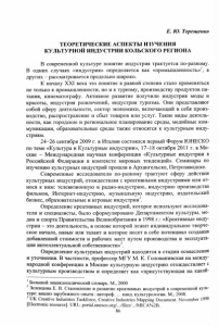 Е. Ю. Терещенко ТЕОРЕТИЧЕСКИЕ АСПЕКТЫ ИЗУЧЕНИЯ КУЛЬТУРНОЙ ИНДУСТРИИ КОЛЬСКОГО РЕГИОНА В современной культуре понятие индустрия трактуется по-разному. В одних случаях «индустрия» определяется как «промышленность»7, в других - рассматривается предельно широко. К началу XXI века это понятие в равной степени стало применяться не только к промышленности, но и к туризму, производству продуктов пи­ тания, кинематографу. Активное развитие получили индустрия моды и красоты, индустрия развлечений, индустрия туризма. Они представляют собой сферу деятельности, сектор экономики, включающий в себя произ­ водство, распространение и сбыт товаров или услуг. Такие виды деятель­ ности, как городское и региональное планирование среды, медийные ком­ муникации, образовательные среды также относятся к культурным инду­ стриям. 24—26 сентября 2009 г. в Италии состоялся первый Форум ЮНЕСКО по теме «Культура и Культурные индустрии», 17-18 октября 2011 г. в Мо­ скве - Международная научная конференция «Культурные индустрии в Российской Федерации в контексте мировых тенденций». Семинары по изучению культурных индустрий прошли в Архангельске, Петрозаводске. Современные исследователи по-разному трактуют сферу действия культурных индустрий, отождествляя с креативными индустриями или от­ нося к ним: телевизионную и радио-индустрию, индустрию производства фильмов, Интернет-индустрию, музыкальную индустрию, издательский бизнес, образовательные и игровые индустрии2. Определение креативных индустрий, которое используют исследова­ тели и специалисты, было сформулировано Департаментом культуры, ме­ диа и спорта Правительства Великобритании в 1998 г.: «Креативные инду­ стрии - это деятельность, в основе которой лежит индивидуальное творче­ ское начало, навык или талант и которое несет в себе потенциал создания добавленной стоимости и рабочих мест путем производства и эксплуата­ ции интеллектуальной собственности»^. Определение культурных индустрий находится в стадии осмысления и уточнения. В частности, профессор МГУ М. К. Голованивская на между­ народной конференции в Москве культурную индустрию отождествляет с культурным производством и определяет как «присутствующая на какой- 7 Большой энциклопедический словарь. М., 2000 Зеленцова Е. В. Становление и развитие креативных индустрий в современной куль­ туре: анализ зарубежного опыта : автореф. ... канд. культурологии. М., 2008. UK Creative Industries Taskforce, Creative Industries Mapping Document. November 1998 [Electronic resource]. IJRL: portal.unesco.org/.. ,/files/.../MICA%2B. 86