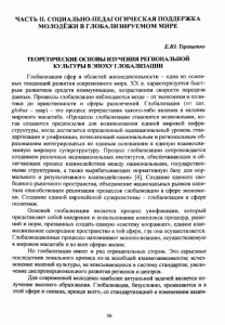 ЧАСТЬ II. СОЦИАЛЬНО-ПЕДАГОГИЧЕСКАЯ ПОДДЕРЖКА МОЛОДЁЖИ В ГЛОБАЛИЗИРУЕМОМ МИРЕ Е.Ю. Терещенко ТЕОРЕТИЧЕСКИЕ ОСНОВЫИЗУЧЕНИЯ РЕГИОНАЛЬНОЙ КУЛЬТУРЫВ ЭПОХУ ГЛОБАЛИЗАЦИИ Глобализация сфер и областей жизнедеятельности - одна из основ ных тенденций развития современного мира. XX в. характеризуется быст рым развитием средств коммуникации, возрастанием скорости передачи данных. Процессы глобализации наблюдаются везде - от экономики и поли тики до нравственности и сферы развлечений. Глобализация (от лат. globus ~ шар) - это процесс перерастания какого-либо явления в явление мирового масштаба. «Процессы глобализации становятся возможными, ко гда создаются предпосылки для возникновения единой мировой инфра структуры, когда достигается определенный наднациональный уровень стан дартизации и унификации, позволяющий национальным и региональным об разованиям интегрироваться по единым основаниям в единую взаимосвя занную мировую суперструктуру. Процесс глобализации сопровождается созданием различных наднациональных институтов, обеспечивающих и об легчающих процесс взаимодействия между национальными, государствен ными структурами, а также вырабатывающих нормативную базу для нор мального и результативного взаимодействия» [4]. Создание единого сво бодного рыночного пространства, объединение национальных рынков капи тала способствовало реализации процессов глобализации в сфере экономи ки. Создание единой европейской суперсистемы - глобализации в сфере политики. Основой глобализации является процесс унификации, который представляет собой внедрение и использование комплекса процедур, реше ний и норм, призванных создать единую «систему координат», единое взаи мосвязанное однородное пространство в той сфере, где она осуществляется. Глобализационные процессы напоминают монополизацию, осуществляемую в мировом масштабе и во всех сферах жизни. Но глобализация имеет и ряд отрицательных сторон. Это серьезные последствия локального кризиса из-за всеобщей взаимозависимости; исчез новение явлений культуры, не вписывающихся в систему стандартов; увели чение диспропорционального развития регионов и центров. Для современной молодежи наиболее актуальной задачей является по лучение высшего образования. Глобализация, безусловно, проявляются и в этой сфере и связана, прежде всего, со стандартизацией и изменением акцен 56