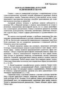 Е.Ю. Терещенко МОРСКАЯ СИМВОЛИКА В РУССКОЙ РЕЛИГИОЗНОЙ КУЛЬТУРЕ Символ - одна из универсалий культуры, к теоретическому и куль- турно-историческому изучению которой обращаются различные области гуманитарного знания. Символика является существенной частью комму­ никативного пространства культуры, способом представления для созна­ ния носителя культуры ее ценностей. Активный всплеск интереса к проблеме символа наблюдается в культуре XX в. Широкий интерес к символу прослеживается не только в различных направлениях философской мысли, но и в самых разнообраз­ ных гуманитарных дисциплинах. Символ становится предметом изучения социологии, культурологии, этнологии, лингвистики, семиотики, психоло­ гии и других наук, а также в сферах религиозного и художественного соз­ нания. Во многом всесторонний интерес к проблеме символизма был ини­ циирован западноевропейским и русским символизмом конца XIX - нача­ ла XX вв. Для русских символистов символическое содержание мира было более реальным, чем его конкретное проявление в социальной действи­ тельности, искусстве и религии. А. Белый определял символ как основную, предельную категорию культуры. Самореализация символа осуществляется в трех сферах: мисти­ ческая сфера - символ является трансцендентной сущностью; сфера сим­ волизма - область теоретико-философских концепций символа; сфера сим­ волизации - область символического творчества во всех сферах жизни. Мир состоит из различных символов, составляющих систему идеальных объектов. Основной характеристикой символа является сложное единство формы и содержания. Любой символ может быть выражен двояко: посред­ ством идеи (понятийно-логически) или посредством образа (ассоциативно) [1, с. 51-57]. А. Белый выдвигает специфическую модель символа. Символ пони­ мается как чувственно воспринимаемый объект, существующий в окру­ жающем нас мире. Он связывает символ с переживанием, сближает приро­ ду символа с природой религии: «религия есть связь единоличных и кол­ лективных переживаний» [1, с. 112]. Серьезный вклад в изучение символа в системе культуры представ­ лено в трудах известного ученого, семиотика, филолога и историка рус­ ской культуры Ю.М. Лотмана. В его работах символ рассматривается как законченный текст, он конвенционален, связующее звено между семиоти­ ческой и внесемиотической реальностью. Символ обладает рядом харак­ терных черт: 41
