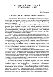 МУРМАНСКОЙ ПИСАТЕЛЬСКОЙ ОРГАНИЗАЦИИ - 30 ЛЕТ В.Л. Тимофеев РОЖДЕНИЕ ПИСАТЕЛЬСКОГО ДОМА НА МуРМАНЕ Перед Великой Отечественной войной в Мурманске появилась группа талантливых литераторов: Александр Подстаницкий, Константин Баев, Кон­ стантин Бельхин, Раиса Троянкер. Поэты погибли в войну, а Р. Троянкер умерла после войны. Во время войны в Заполярье воевали Николай Букин, Николай Флеров, Николай Панов, Ярослав Родионов, Павел Шубин, Александр Ойслендер, Муталиб Митаров, Константин Тюляпин, Дмитрий Ковалев. Сюда приезжа­ ли Вениамин Каверин, Константин Симонов, Александр Жаров, Александр Прокофьев, Валентин Пикуль, Иван Шамякин, Дмитрий Ковалев и др. После войны почти все они уехали в южные центры. 50-е гг. - взлет Военно-морского флота, соединившийся с эпохой «от­ тепели». В Североморске создается литературное объединение, из которого выйдут в мир более двух десятков профессиональных писателей, в том числе Николай Рубцов. Первую школу в нем прошли и несколько мурманчан: Ста­ нислав Панкратов, Борис Романов, Викдан Синицын, Виктор Тимофеев и др. Конец 50-х гг. В Мурманске созданы книжное издательство и област­ ное литературное объединение, быстро собравшее молодые литературные силы. К концу 60-х гг. сложилось ядро литературного объединения как лите­ ратурная организация. В ее составе было уже более двух десятков поэтов и прозаиков, имеющих первые книжные публикации. 70-е гг. - это годы, когда проводились литературные семинары, музы­ кально-поэтические праздники; издавалось много произведений в журналах, издавались книги. Это годы циклов телевизионных передач, телефильмов, радиоспектаклей. В литобъединение уже входили, руководя им, двое членов Союза писателей СССР: прозаик Борис Романов и поэт Виктор Тимофеев. Приняты в Союз писателей они были в Карелии, потому что своей организа­ ции в Мурманской области еще не было. Создание писательской организации было бы еще одним мощным культурным источником, духовным рычагом. Это понимали все, но и осто­ рожничали почти все. Так, переселившийся к нам писатель Станислав Пан­ кратов, член Союза писателей СССР, не проникся верой в литературные си­ лы Заполярья. После отъезда С. Панкратова я предложил Борису Романову обратиться к московской и мурманской властям. Б. Романов, как всегда иро­ ничный, воздержался, зная, что в Мурманском областном активе есть злопы­ хатели, т.е. те, кто не хотел открывать дорогу Союзу писателей на Севере. 4