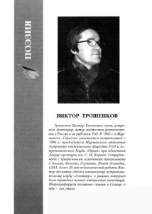 ВИКТОР ТРОШЕНКОВ Трошенков Виктор Евгеньевич, поэт, астро­ ном, фотограф, автор множества фотовыста­ вок в России и за рубежом. Род. В 1962 г. в Мур­ манске. Серьёзно занимается астрономией с 1986 г., председатель Мурманского отделения Астрономо-геодезического общества РАН и Ас­ трономического Клуба «Орион» при областном Дворце культуры им. С. М. Кирова. Сотрудни­ чает с профильными солнечными программами в Англии, Бельгии, Германии, Новой Зеландии, США. Более 20 лет педагогической работы Вик­ тор посвятил детско-юношескому астрономи­ ческому клубу «Альтаир», в рамках которого было проведено немало интересных экспедиций. Фотографирует полярные сияния и Солнце, о чём — его стихи.