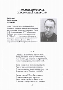 Трусов, В. В. «Маленький город, стеклянный насквозь» : стихи // Щедра Россия словом родниковым : к Дню поэзии Кольского Заполярья / Мурм. отд-ние Союза писателей России. - Мурманск, 2012. - С. 80-83.
