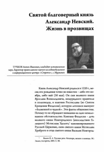 Святой благоверный князь Александр Невский. Жизнь в прозвищах ТУЧКОВ Антон Иванович, кандидат исторических наук, директор православного научно-исследовательского и информационного центра «Стрета», г. Мурманск Князь Александр Невский родился в 1220 г., ме­ сяц его рождения точно не известен - либо это но­ ябрь, либо май (30 мая). Он сын великого князя Ярослава Всеволодовича, незаурядного правителя и полководца, и княгини Ростиславы (во Святом Крещении Феодосии), которую летописи именуют «блаженной и чудной». Эти факты общеизвестны. Почему-то не обращают внимания на одно немало­ важное обстоятельство. Княгиня Феодосия - дочь великого князя Новгородского (впоследствии Га­ лицкого) Мстислава Малого,1канонизированного Русской Церковью, сына святого князя Мстислава Храброго и отца святого князя Василия Новгород- 1 Волков В. А. Русская рать: богатыри, витязи и воеводы. М.: Эксмо; Алгоритм, 2005. С. 96.