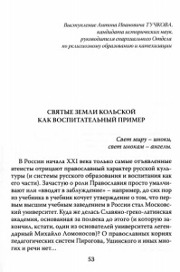 Выступление Антона Ивановича ТУЧКОВА, кандидата исторических наук, руководителя епархиального Отдела порелигиозному образованию и катехизации СВЯТЫЕ ЗЕМЛИ КОЛЬСКОЙ КАК ВОСПИТАТЕЛЬНЫЙ ПРИМЕР Свет миру - иноки, свет инокам - ангелы. В России начала XXI века только самые отъявленные атеисты отрицают православный характер русской куль туры (и системы русского образования и воспитания как его части). Зачастую о роли Православия просто умалчи вают или «вводят в заблуждение» - например, до сих пор из учебника в учебник кочует утверждение о том, что пер вым высшим учебным заведением в России стал Московс кий университет. Куда же делась Славяно-греко-латинская академия, основанная за полвека до этого (и которую за кончил, кстати, один из основателей университета леген дарный Михайло Ломоносов)? О православных корнях педагогических систем Пирогова, Ушинского и иных мно гих и речи нет... 53