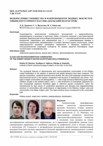 DOI: 10 .25702/KSC .2307-5228-2018-10-1-23-35 УДК 574.52 ВОДОРОСЛЕВЫЕ СООБЩЕСТВА И МАКРОЗООБЕНТОС ВОДНЫХ ЭКОСИСТЕМ ХИБИНСКОГО ГОРНОГО МАССИВА (КОЛЬСКИЙ ПОЛУОСТРОВ) Д. Б. Денисов, С. А. Валькова, Н. А. Кашулин ФГБУН Институт проблем промышленной экологии Севера КНЦ РАН Аннотация Анализируются экологические особенности альгоценозов и макрозообентоса, развивающихся в водоемах и водотоках Хибин, в аспектах сезонной и пространственной динамики. Выделены два типа сообществ водорослей: 1— с высокой долей нитчатых зеленых водорослей, характерных для загрязняемых вод; 2 — с доминированием харовых и золотистых водорослей, развивающихся в условно фоновых водных экосистемах. Озера характеризуются высокими значениями численности и биомассы зообентоса и олигодоминанатной структурой сообществ. По уровню развития бентофауны озера соответствуют а-эвтрофному типу. Ключевые слова: Хибинский горный массив, малые реки, бентос, фитоперифитон, биоиндикация. ALGAE AND MACROZOOBENTHOS COMMUNITIES OF THE KHIBINY MASSIF’S WATER ECOSYSTEMS (KOLA PENINSULA) Abstract Keywords: Dmitriy B. Denisov, Svetlana A. Valkova, Nikolay A. Kashulin Institute of North Industrial Ecology Problems of the KSC of the RAS The ecological features of algocoenoses and macrozoobenthos communities of the Khibiny massif freshwaters in the aspects of seasonal and spatial dynamics have been analyzed. The species composition, seasonal dynamics were studied; the role of the landscape component and hydrochemical factors in the species composition and structure of hydrobionts was shown. Two types of algae communities are distinguished: 1 — with a high amount of filamentous green algae (Ulothrix zonata) in the polluted waters, and 2 — with domination of Charophyta (Zygnema sp.) and Chrysophyta (Hydrurus fuentidus) algae in reference aquatic ecosystems. Lakes are characterized by high values of zoobenthos abundance and biomass and oligodominantate structure of communities with predominance of oligochaetes in the Bolshoy Vudjavr Lake and chironomids in the Maliy Vudjavr Lake. The lake's benthos fauna corresponds to the а-eutrophic type. Khibiny massif, small rivers, benthos, phytoperiphyton, bioindication. Введение Антропогенная трансформация водных экосистем промышленных регионов Кольского Севера является объектом экологических исследований ни одно десятилетие [1, 2]. Показано, что происходящие изменения различных структурно-функциональных элементов в последние годы вызваны не только долговременным промышленным загрязнением, но и нарушением ландшафтов, режима стока, температурных параметров, что неизбежно сказалось на трофических сетях и потоках энергии в экосистемах [3]. Сложность в интерпретации последствий антропогенных преобразований водоемов Кольского региона определяется большой вариабельностью индивидуальных условий формирования качества вод: микроклиматических, батиметрических, гидрохимических, ВЕСТНИК Кольского научного центра РАН 1/2018(10) 23