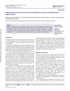 Downloaded by [Professor Vladimir Dauvalter] at 05:55 30 August 2017 JOURNAL OF ENVIRONMENTAL SCIENCE AND HEALTH, PART A 2017, VOL. 52, NO. 9, 921-929 https://doi.org/10.1080/10934529.2017.1318633 . < Л Taylor &. Francis С J Taylor &FrancisGroup I Л ) C heck for updates Selected aspects of the current state of freshwater resources in the Murmansk region, Russia Nikolay A. Kashulin, Vladimir A. Dauvalter, Dmitry B. Denisov, Svetlana A. Valkova, Oksana I. Vandysh, Petr M. Terentjev, and Alexander N. Kashulin Institute of the North Industrial Ecology Problems, Kola Science Center, Russian Academy of Science, Apatity, Murmansk, Russia ABSTRACT Aspects o f reducing the resource potential of surface waters of the Murmansk region in the global climate change and the environment and their irrational use have been considered. Increase of aquatic environment toxicity, drastic restructuring o f the structural and functional characteristics of aquatic communities, changes in trophic status o f lakes, reducing the stability of freshwater ecosystems, increasing the risk of catastrophic degradation have been shown. Taking into account the regional peculiarities, some indicators of surface water quality in the Murmansk region have been proposed. Introduction Among the natural resources in the Arctic, surface waters play the most important role. Two components of such resources can be distinguished: water resources and biological resources, including fish. The resource potential of surface waters can be determined by both quantitative and qualitative indicators, including water quality indicators and structure-functional parameters of hydrobiont com munities. Bodies of water consist of two interrelated and interde pendent parts: a catchment area and the body ofwater itself. To a large extent, lakes and rivers determine the economic and social development of Northern regions. They are sources of provisions and have close relationships with the cultural her itage of indigenous peoples, constituting a part of their habitats. Fresh water serves as a source of energy and water for popula tion and industry, thruways to other regions, places for com mercial and sport fishery and for fish-farming, recreation sites promoting the development of tourism, and sites for recreation and health recovery for local populations, with important aes thetic and spiritual meaning. In general, the Murmansk region has substantial water resources. There are 107146 lakes on its territory (with surface area 8195 km). Mean over-year river run-off is 65.7 km3/year. However, the structure of the hydrographic network in the Murmansk region is quite peculiar. It is characterized by an abundance of small rivers (95% of all rivers are shorter than 10 km). The total lake ratio is 6%, but most of the lakes (99%) are small and have surface area less than 1 km2. The natural behaviour of the largest lakes and rivers is regulated by water controlling structures such as hydroelectric power plants.[1] Further, there are large industrial enterprises and towns in the catchment areas of the largest lakes and rivers, using them for ARTICLE HISTORY Received 11 January 2017 Accepted 14 March 2017 KEYWORDS Aquatic organisms; freshwater resources; heavy metals; ichthyofauna; sediments; water; water ecosystems water supply and waste disposal; therefore, rapid degradation of the water quality can be observed. Total water intake of the Murmansk region is 1.63 km3/year, of which 1.6 km3/year is used for industrial and utility needs.[2] Therefore, the water resources currently in use are limited, and their quality contin ues to decrease. It is necessary to review the main principles of water management in the region and to develop a system of water quality management and control. The present article con centrates on selected aspects of these issues. Materials and methods This article was based on the results of long-term (from 2000 till 2013) integrated studies of freshwater ecosystems of the northwestern part of the Murmansk region and the frontier ter ritory between Russia, Norway and Finland. Sediment samples from the lakes were collected with a gravitational corer and vertically sliced into 1-cm layers for analysis.[3] Concentrations of heavy metals (Ni, Cu, Co, Zn, Cd, Pb, Hg and As) in the sediment samples, extracted by the concentrated nitric acid, were analysed by atomic absorption spectrophotometry. Techniques for the chemical analysis are described in detail earlier.[4,5] The quality of the data obtained has been assessed by comparison with the standard-samples solutions within the framework of the international intercalibration (Intercomparison 0115, Norwegian Institute for Water Research).[6] Sampling and analysis of the phytoplankton, zooplankton, zoobenthos and phytoperiphyton were performed using stan dard techniques.[7,8] Fish were caught with a standard set of gill nets, 25 m long and 1.5 m high, and mesh sizes: 16, 20, 31, 36, and 40 mm. CONTACT Vladimir A. Dauvalter @ vladimir@inep.ksc.ru © Institute of the North Industrial Ecology Problems, KSC, RAS, Fersman str. 14, Apatity 184209, Murmansk, Russia. © 2017 Taylor & Francis Group, LLC