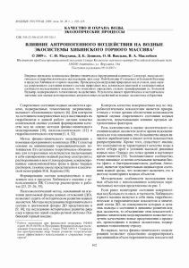 ВОДНЫЕ РЕСУРСЫ, 2009, том 36, № 1, с. 102-116 _________________________ КАЧЕСТВО И ОХРАНА ВОДЫ, _________________________ ЭКОЛОГИЧЕСКИЕ ПРОЦЕССЫ УДК 536-12:504.42.05:591.524.1 ВЛИЯНИЕ АНТРОПОГЕННОГО ВОЗДЕЙСТВИЯ НА ВОДНЫЕ ЭКОСИСТЕМЫ ХИБИНСКОГО ГОРНОГО м а с с и в а 1 © 2009 г. С. И. Мазухина, Д. Б. Денисов, О. И. Вандыш, В. А. Маслобоев Институт проблем промышленной экологии Севера Кольского научного центра Российской академии наук 184200 Апатиты, ул. Ферсмана, 14а Поступила в редакцию 09.10.2007 г. Впервые проведено комплексное физико-химическое (программный комплекс Селектор), палеоэколо гическое и гидробиологическое исследование двух озер: Пай-Кунъявр (Гольцовое) и Большой Вудъявр в пределах Хибинского горного массива. Проведена реконструкция природных вод и стоков, дана оцен ка современного состояния ионного состава природных вод, комплексов диатомей и зоопланктонных сообществ исследованных водоемов, что позволило определить степень трансформации оз. Большой Вудьявр, подверженного техногенному воздействию. Результаты имеют практическое и методическое значение для оценки долговременных антропогенных воздействий на водные экосистемы субарктики. Современное состояние водных экосистем в аре алах, подверженных техногенному загрязнению, вызывает обоснованную тревогу [ 6 ]. Для контроля за состоянием поверхностных вод и населяющих их гидробионтов в данной работе сделана попытка комплексной оценки условий формирования каче ства вод на основе методов физико-химического моделирования [18], палеоэкологического [ 12 ] и гидробиологического изучения [1, 4, 32]. Метод физико-химического моделирования с помощью программного комплекса (ПК) Селектор основан на минимизации термодинамических по тенциалов. Его детальное теоретическое обоснова ние для гетерогенных мультисистем (включающих в себя одновременно водный раствор электролита с растворенными в нем углеводородами, конденсиро ванные однокомпонентные фазы и фазы твердых растворов, газовую смесь) представлено в классиче ской монографии И.К. Карпова [18]. Формирование состава поверхностных и под земных вод в пределах Хибинского массива с ис пользованием ПК Селектор рассмотрено в рабо тах [23, 25-26, 35]. Палеоэкологический метод, основанный на изу чении диатомовой флоры донных отложений (ДО), позволяет судить об историческом развитии водных экосистем. Методы исследования гидрохимического состава и диатомовой флоры ДО представлены в [9, 10], где исследовано историческое развитие ряда озер в пределах одной озерно-речной системы (Хи бинский горный массив). 1 Работа выполнена при финансовой поддержке РФФИ (грант 06-05-64708) иПрограммы фундаментальных иссле дований Отделения наук о Земле РАН ОНЗ-3 “Техноген ное преобразование недр Земли: развитие теоретических основ эффективного использования и сохранения георе сурсов”. Контроль качества поверхностных вод по гид робиологическим показателям является приори тетным с точки зрения обеспечения возможности прямой оценки современного состояния водных экосистем, испытывающих влияние вредных ан тропогенных факторов. Роль зоопланктона в оценке экологического со стояния водных экосистем долгое время недооцени валась на том основании, что большинство видов яв ляются эврибионтами и имеют почти повсеместное распространение. Кроме того, существует мнение, что зоопланктон не характеризует качество вод