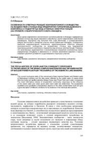 УДК 574.5; 577.472 О.И.Вандыш ОСОБЕННОСТИ ОТВЕТНЫХ РЕАКЦИЙ ЗООПЛАНКТОННОГО СООБЩЕСТВА НА ВОЗДЕЙСТВИЕ СТОЧНЫХ ВОД ПРЕДПРИЯТИЙ ГОРНОПРОМЫШЛЕННОГО КОМПЛЕКСА И ПОДОГРЕТЫХ ВОД АТОМНЫХ ЭЛЕКТРОСТАНЦИЙ (НА ПРИМЕРЕ СУБАРКТИЧЕСКОГО ОЗЕРА ИМАНДРА) Аннотация Дана оценка современного экологического состояния районов оз.Имандра, подверженных влиянию сточных вод медно-никелевого (губа Монче), апатит-нефелинового (губа Белая) производств, подогретых вод Кольской АЭС (губа Молочная), и условно-фонового района (восточный и западный участки плеса Бабинская Имандра). Определены наиболее информативные показатели, характеризующие ответную реакцию зоопланктонного сообщества на воздействие сточных вод предприятий горнопромышленного комплекса и подогретых вод атомных электростанций. Показано, что качественные характеристики и количественные показатели зоопланктона имеют определенную специфику в зависимости от степени загрязнения водоема и хорошо отражают различия условий его существования в отдельных участках. Ключевые слова: озеро Имандра, зоопланктон, мониторинг, информативные показатели сообщества. O.I.Vandysh THE PECULIARITIES OF ZOOPLANKTON COMMUNITY RESPONSES TO THE INFLUENCE OF THE MINING COMPLEXWASTEWATER AND THEWARM WATER OF NUCLEAR POWER PLANTS (BY THE EXAMPLE OF THE SUBARCTIC LAKE IMANDRA) Abstract The current ecological state of the natural part of lake Imandra (Eastern and Western parts of Babinskaya Imandra) and the lake areas, affected by the waste water of copper-nickel (Monche-Guba) and apatite-nepheline (Belaya Guba) clear Power Plant warm water, is assessed. The most informative indices of zooplankton community responses to the influence of the waste water and uclear power plant warm water are determined. The zooplankton Qualitative and quantitative characteristics depend on the water contamination level and give a good discription of different conditions for its existence in the individual lake sections. Key words: Lake Imandra, zooplankton, monitoring, informative indices o f community. Введение Усиление антропогенного воздействия приводит к качественному изменению водной среды, на которое гидробионты реагируют изменением видового состава, численности, морфологии и биологии. В связи с этим необходима организация контроля за качеством поверхностных вод и населяющих их гидробионтов. Качество воды формируется биотой, ее способностью осуществлять процессы продуцирования и самоочищения вод. Биота - естественный материальный носитель качества воды, и ее изменения позволяют судить о степени антропогенного воздействия на экосистемы (Балушкина, 2006). Зоопланктонное сообщество - часть экосистемы озера, тесно связанная со всеми остальными его звеньями и отражающая общее состояние водоема, - служит надежным индикатором качества вод. Усиление антропогенного воздействия приводит к изменению условий существования организмов, что отражается на видовом составе, количественных показателях, соотношении отдельных таксономических групп, структуре популяций зоопланктеров. 149
