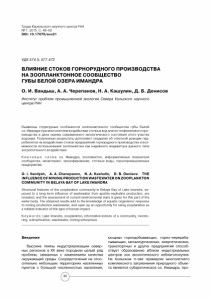 Труды Карельского научного центра РАН № 1. 2015. С . 48-62 DOI: 10.17076/есо21 УДК574.5; 577.472 ВЛИЯНИЕ СТОКОВ ГОРНОРУДНОГО ПРОИЗВОДСТВА НАЗООПЛАНКТОННОЕ СООБЩЕСТВО ГУБЫ БЕЛОЙ ОЗЕРА ИМАНДРА О. И. Вандыш, А. А. Черепанов, Н. А. Кашулин, Д. Б. Денисов Институт проблем промышленной экологии Севера Кольского научного центра РАН Выявлены структурные особенности зоопланктонного сообщества губы Белой оз. Имандра при многолетнем воздействии сточных вод апатит-нефелинового про изводства и дана оценка современного экологического состояния этого участка водоема. Полученные результаты дополняют сведения об ответной реакции гид- робионтов на воздействие стоков предприятий горнорудного производства и воз можности использования зоопланктона как надежного индикатора данного типа антропогенного воздействия. К л ю ч е в ы е с л о в а : оз. Имандра, зоопланктон, информативные показатели сообщества, мониторинг, эвтрофирование, сточные воды, горнопромышленные предприятия. О. I.Vandysh, A. A. Cherepanov, N. A. Kashulin, D. В. Denisov. THE INFLUENCEOF MINING PRODUCTION WASTEWATER ON ZOOPLANKTON COMMUNITY IN BELAYA BAY OF LAKE IMANDRA Structural features of the zooplankton community in Belaya Bay of Lake Imandra, ex posed to a long-term influence of wastewater from apatite-nepheline production, are revealed, and the assessment of current environmental state is given for this part of the water body. The obtained results add to the knowledge of aquatic organisms’ response to mining production wastewater, and open up an opportunity for using zooplankton as a reliable indicator of this type of human impact. K e y w o r d s : Lake Imandra, zooplankton, informative indices of a community, monito ring, eutrophication, wastewater, mining enterprises. Введение Высокие темпы индустриализации север ных регионов в XX веке породили целый ряд проблем, связанных с изменением качества окружающей среды. Сосредоточение на отно сительно небольших территориях населенных пунктов с большой численностью населения, мощных горнодобывающих, горно-перераба- тывающих, металлургических, энергетических, транспортных и других предприятий способ ствует образованию вблизи индустриальных центров зон экологического неблагополучия. На Кольском п-ове примером многолетнего комплексного загрязнения природного объек та является субарктическое оз. Имандра, про