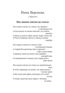 Воронова, И. Ю. Мы пишем снегом на стекле : стихотворение / Инна Воронова // Я - Россия. – Новокузнецк : Союз писателей, 2023.