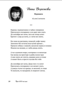 Воронова, И. Ю. «Вороны-мурманчанки и чайки-северянки…» : стихотворение / Инна Воронова // Про100поэзия. – Новокузнецк : Союз писателей, 2023. - С. 26.
