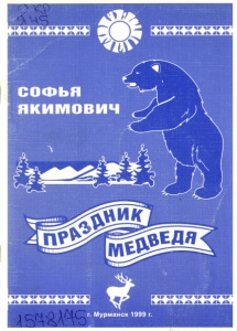 Якимович, С. Е. Праздник медведя : стихи : (перевод с саамского) / Софья Якимович ; [лит. об-ние при Мурм. орг. Союза писателей России] ; пер. с саам. [и сост. Синицын В. В. ; вступ. ст. В. Тимофеева]. - Мурманск : [б. и.], 1999. - 30 с., [1] л. портр.