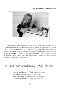 ЕКАТЕРИНА ЯКОВЛЕВА Екатерина Викторовна Яковлева родилась 1986 году в г. Заполярный. В 2003 году стала лауреатомпремии К. Баева -А. Подстаницкого. В 2009 году окончила факультет психологииМурманского гуманитарного института. Работает в Мурманской городской клинической больнице. Член Мурманского областного литературного объединения Союза писателей России «Мурман». В СЕБЕ ТЫ ПОНЕСЕШЬ МОЁ ТЕПЛО... Чашка разбилась. О бабушке память. Слезно осколки блестят на полу... Я осторожна, чтоб пальцы не ранить, Сердце не ранить - уже не смогу... 163