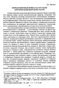Д.Е. Жалнин ПЕРВАЯ МИРОВАЯ ВОЙНА НА РУССКОМ АРКТИЧЕСКОМ МОРСКОМ ТЕАТРЕ Боевые действия на русском арктическом морском театре в годы Пер вой мировой войны носили вспомогательный характер, вследствие чего они стали объектом изучения исключительно отечественных историков1. Обычно действия союзных флотов в этих исследованиях рассматривались весьма фрагментарно. Несколько полнее была описана деятельность в этом районе кораблей германского флота. Как правило, специальные исследова ния основывались на мемуарах представителей германского военно-мор ского командования, опубликованных вскоре после окончания войны2. Исход будущей войны на море связывался основными соперниками - Великобританией и Германией —с уничтожением главных сил флота про тивника в генеральном сражении. Германский флот явно уступал англий скому, а потому, чтобы иметь шанс на победу в таком бою, немцам необ ходимо было хотя бы уравнять силы. Решено было ослабить флот против ника, уничтожая его отдельные части. Для этого предполагалось восполь зоваться ожидаемой блокадой англичанами подступов к германским воен но-морским базам. Однако накануне войны британская правительственная комиссия выявила противоречивость планов, разработанных Адмиралтей ством, что привело к отказу от идеи «ближней» блокады. Главнокоман дующий английским Большим флотом адмирал Д. Джеллико отдавал пред почтение «дальней» блокаде, при которой дозорные линии перекрывали выходы из Северного моря, становившегося огромным театром военных действий3. С запада район был ограничен Дуврским патрулём, защищав шим от проникновения противника в Английский канал. Побережье Анг лии прикрывали семь дозорных линий, а между Шетлендскими островами и побережьем Норвегии был развёрнут Северный патруль, который дол жен был воспрепятствовать прорыву германских кораблей из Северного моря к западному побережью Англии и в Атлантику. Именно кораблям Северного патруля пришлось взять на себя дополнительную задачу обес печения обороны северного русского морского театра. Хотя русское общественное мнение проявляло большой интерес к ос воению Северного морского пути, в том числе и в военных целях, эти планы ' Последнее, наиболее полное исследование этой темы: Фокеев К Ф. Действия русской флотилии Северного Л едовитого океана 1914-1917 // Флот в первой мировой войне. - М., 1964.- Т . 1 .- С . 577-642. 2 Шеер Р. Германский ф л о тв Мировую войну. - М.; Л., 1940,; Михельсен А. Подводная война 1914-1918 гг. - М.; Л., 1940., Гайер А. Германские подводные лодки в войну 1914-1918 гг. - Л ., 1933. 3 Ф лот в первой мировой войне. - М., 1964. - Т. 2. - С. 15-16,28. 49