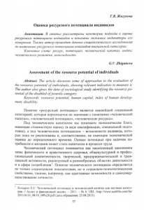 Г. В. Жигунова Оценка ресурсного потенциала индивидов Аннотация. В статье рассмотрены некоторые подходы к оценке ресурсного потенциала индивидов и показаны значимые индикаторы его измерения. Также автор приводит данные социологического исследования по выявлению ресурсного потенциала инвалидов ювенальной категории. Ключевые слова: ресурс, потенциал, человеческий капитал, индекс человеческого развития, инвалидность. G. V. Zhigunova Assessment o f the resource potential of individuals Abstract. The article discusses some o f approaches to the evaluation oj the resource potential o f individuals, showing relevant indicators to measure it. The author also gives the data o f sociological study identifying the resource po- tential o f the disabled o f juvenile category. Keywords: resource potential, human capital, index o f human develop- ment, disability. Понятие «ресурсный потенциал» является важнейшей социальной категорией, которая пересекается по значению с понятиями «человеческий капитал», «человеческий потенциал», «человеческие ресурсы». Под человеческим капиталом мы понимаем экономические блага, имеющие стоимостную оценку (в виде квалификации, специальной подго­ товки), а под человеческим потенциалом - возможности индивида, кото­ рые пока не реализованы и, соответственно, не имеющие экономической оценки до определенного времени. Однако потенциал при наличии по­ требности и желания может стать капиталом в процессе труда. Человеческий потенциал понимается как накопленный населением запас физического и нравственного здоровья, общекультурной и профес­ сиональной компетентности, творческой, предпринимательской и граж­ данской активности, реализуемый в разнообразных областях деятельности и в сфере потребления1. Понятие человеческого потенциала определяется не только социальными показателями, но и социально-психологическими свойствами, такими, например, как адаптивные возможности и самосовер­ шенствование личности. 1 Котырло F..C. Человеческий потенциал и человеческий капитал как научные катего­ рии // Аудит и финансовый анализ. - 2011. - № 6. URL: http://www.auditfm.com/fin/ 2011 /6/10_08/10_08%20.pdf (дата обращения: 25.08.2013). 57