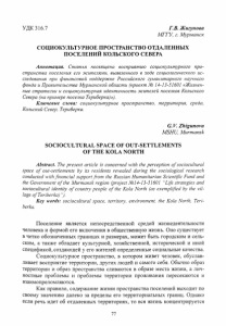 УДК 316.7 Г.В. Жигунова МГГУ, г. Мурманск СОЦИОКУЛЬТУРНОЕ ПРОСТРАНСТВО ОТДАЛЕННЫХ ПОСЕЛЕНИЙ КОЛЬСКОГО СЕВЕРА Аннотация. Статья посвящена восприятию социокультурного про странства поселения его жителями, выявленного в ходе социологического ис следования при финансовой поддержке Российского гуманитарного научного фонда и Правительства Мурманской области (проект № 14-13-51601 «Жизнен ные стратегии и социокультурная идентичность жителей поселков Кольского Севера (на примере поселка Териберка)»). Ключевые слова: социокультурное пространство, территория, среда, Кольский Север, Териберка. G. V. Zhigunova MSHU, M urmansk SOCIOCULTURAL SPACE OF OUT-SETTLEMENTS OF THE KOLA NORTH Abstract. The present article is concerned with the perception o f sociocultural space o f out-settlements by its residents revealed during the sociological research conducted with financial support from the Russian Humanitarian Scientific Fund and the Government o f the Murmansk region (project №14-13-51601 “Life strategies and sociocultural identity o f country people o f the Kola North (as exemplified by the vil- lage ofTeriberka) "). Key words: sociocultural space, territory, environment, the Kola North, Teri- berka. Поселение является непосредственной средой жизнедеятельности человека и формой его включения в общественную жизнь. Оно существует в четко обозначенных границах и размерах, может быть городским и сель ским, а также обладает культурной, хозяйственной, исторической и иной спецификой, создающей у его жителей определенные социальные качества. Социокультурное пространство, в котором живет человек, обуслав ливает восприятие территории, других людей и самого себя. Обычно образ территории и образ пространства сливаются в образе места жизни, а лич ностные проблемы и проблемы территории проживания пересекаются и взаимопреломляются. Как правило, содержание жизни пространства поселений выходит по своему значению далеко за пределы его территориальных границ. Однако если речь идет об отдаленных территориях, то вся жизнь концентрируется 77