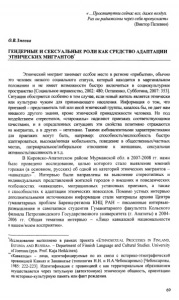 « ...Проститутки сейчас все, даже воздух. Раз он радиоволны через себя пропускает» (Виктор Пелевин) О.В.Змеева ГЕНДЕРНЫЕ И СЕКСУАЛЬНЫЕ РОЛИ КАК СРЕДСТВО АДАПТАЦИИ ЭТНИЧЕСКИХ МИГРАНТОВ* Этнический мигрант занимает особое место в регионе «прибытия», обычно это человек низкого социального статуса, который находится в маргинальном положении и не имеет возможности быстро включиться в социокультурное пространство [Социачьное неравенство, 2002: 480; Остапенко, Субботина, 2007: 353]. Ситуация обостряется особенно в том случае, если новый житель является этнически или культурно чужим для принимающего населения. Информация о том, что приезжий - представитель той или иной этнический группы, казалось бы, не дает нам никакого другого знания, кроме этнической принадлежности человека. Но под воздействием стереотипов, «старожилы» наделяют приезжих соответствующими качествами, и в определенных ситуациях эти свойства позитивно отражаются на мигрантах, а в других - негативно. Такими амбивалентными характеристиками для приезжих могут быть, например: способность/неспособность быстро адаптироваться, высокая/низкая мобильность, поведение в общественных/частных местах, патриархальное/либеральное отношение к женщинам, сексуальная активность/пассивность и т.д. В Кировско-Апатите ком районе Мурманской обл. в 2007-2008 гг. нами было проведено исследование, целью которого стало выявление мнений горожан (в основном, русских) об одной из категорий этнических мигрантов - «кавказцах» . Интервью были направлены на выяснение стереотипных и индивидуальных представлений жителей городов о внешних и поведенческих особенностях «кавказцев», миграционных установках приезжих, а также о способностях к адаптации этнических новоселов. Помимо устных интервью дополнительными источниками информации стали материалы архива Центра гуманитарных проблем Баренц-региона КНЦ РАН - письменные интервью- размышления и самозаписи студентов Гуманитарного факультета Кольского филиала Петрозаводского Государственного университета (г. Апатиты) в 2004- 2006 гг. Общая тематика интервью - «Лицо кавказской национальности в вашем/моем восприятии». Исследование выполнено в рамках проекта «E thnosexual P rocesses in F inland , E stonia and R ussia ». - Department of Finnish Language and Cultural Studies. University of Joensuu (рук. Prof. Kaja Heikkinen). «Кавказцы» - лица, идентифицируемые по их связи с историко-этнографической провинцией Кавказ и Закавказье (типология Н.Н. и И.А.Чебоксаровых) [Чебоксаровы. 1985: 222-223]. Идентификация с провинцией с как территориальным образованием осуществляется через титульную (автохтонную) этническую общность, ориентацию на историко-культурную память или факт рождения. 69