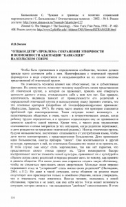 Баньковская С. Чужаки и границы: к понятию социальной маргинальное™ / С. Баньковская // Отечественные записки. - 2002. - № 6. Режим доступа: http://www.strana-oz.ru/?numid=7&article-327 Zimmel G. The Stranger // The Sociology. - New York: Free Press, 1950. - P. 402- 408. Режим доступа: http://www2.pfeiffer.edu/~lridener/DSS/Simmel/STRANGER.html О.В.Змеева "ОТЦЫ И ДЕТИ": ПРОБЛЕМА СОХРАНЕНИЯ ЭТНИЧНОСТИ И ВОЗМОЖНОСТИ АДАПТАЦИИ "КАВКАЗЦЕВ" НА КОЛЬСКОМ СЕВЕРЕ Чтобы быть признанным в определенном сообществе, человек должен прежде всего соотнести себя с ним. Идентификация с этнической группой формируется в виде стереотипов и складывающейся на их основе системы представлений об этнической группе. На этничность человека влияют как объективные, так и субъективные факторы. Их совокупность позволяет человеку выработать некие представления об этнической группе, в которой он проживает, принять или отвергнуть ценности данного этноса, отождествлять себя с ним или нет. Как правило, идентичность индивида зависит от принадлежности его родителей к определенной этнической группе и используемому языку (принято считать, что это основные критерии (подробнее об этнодифференцирующих признаках: (Файзуллин, Зарипов, 1997). Но очень часто именно эти критерии становятся проблемой при самоопределении. Такая ситуация может возникнуть в полиэтнических обществах и очень часто - в гетероэтнических семьях, когда ребенку трудно определиться, а в процессе социализации ему не прививаются ценности какой-то одной группы. Кроме того, с такого рода трудностями сталкиваются и семьи мигрантов (в тех ситуациях, когда родители переезжают, и дети рождаются за пределами этнической родины). Иногда этническая группа, будучи меньшинством, постепенно отказывается от употребления языка, чтобы дети могли контактировать с представителями большинства. Дети принимают идеи большинства, иногда презирая "своих". Они воспитываются в другой культуре, привыкают к ней, но этническое большинство может и не принять их. В этом случае они могут стать маргиналами, так как нет гарантии, что представители своего этноса примут их. "Дети иммигрантов быстро воспринимают многие элементы новой культуры, сравнивают их с культурой и образом жизни своих родителей и нередко решают жить по-новому, как принято в данном обществе. И в своих домах они стараются создать такую обстановку, чтобы не стесняться приглашать своих сверстников. Молодые люди нередко переживают стыд за "устаревший" стиль жизни своих родителей" (Налчаджян, 2004, с.112). Но даже в такой ситуации, когда общение на родном языке отсутствует или практикуется только в семейном общении, нельзя утверждать, что и этничность тоже изменится. Иногда человек, оказываясь в новой обстановке, теряется и не знает, как ему себя вести. Тогда может возникнуть ситуация, которая связана с так называемым "двойным" самосознанием. В этом 116