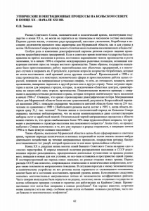 ЭТНИЧЕСКИЕ И МИГРАЦИОННЫЕ ПРОЦЕССЫ НА КОЛЬСКОМ СЕВЕРЕ В КОНЦЕ XX - НАЧАЛЕ XXI ВВ. О.В. Змеева Распад Советского Союза, экономический и политический кризис, настигнувшие госу дарство в конце XX в., не могли не отразиться на этническом и численном составе населения. Падение уровня жизни, остановка ряда предприятий, массовые увольнения, безработица в по следнее десятилетие прошлого века характерны для Мурманской области, как и для страны в целом. На КольскомСевере к началу нового столетия около половины населенияжило вбедности1. Особую роль в изменении демографической картины региона сыграло падение произ водства градообразующих предприятий. Если в советское время политика государства была на правлена на приток населения в регион, постоянное наращивание темпов производства и роста экономики, то в начале 1990-х открытие международных рыночных площадок, возникшая кон куренция снизили спрос на товары местного производства. Таким образом, государство вынуж дено было приостанавливать работу нерентабельных или убыточных предприятий, а в некото рых случаях и закрывать их. В результате, в регионе возросло количество безработных, которые не могли восстановить свой прежний доход другими способами2. Произошедший в 1990-е гг. спад производства, а в некоторых экономических сферах и приостановление работы целых от раслей, повлияли на миграционные установки северян, то есть их готовность покинуть место проживания, намерение переехать в другой регион или в другую страну. Такая ситуация харак терна в целом для северных городов, которые, за исключением областных центров, ориентиро ваны на какую-либо одну отрасль производства. Показательными являются примеры с север ными и дальневосточными регионами страны, которые потеряли значительную часть населения в начале 1990-х3. Очевидно, что кризис спровоцировал демографические потери. Миграционная убыль для Мурманской области была весьма существенной, результаты Всероссийской перепи си населения 2002 г. показали сокращение численности жителей области более чем на 254 тыс. человек по сравнению с 1989 г. Наибольшего размаха выезд достиг в 1992 г., когда область по теряла сразу 31,1 тыс. человек4. Условия жизни в постсоветский период на Кольском Севере оказались настолько неблагоприятны, что не могли компенсироваться даже соответствующим набором льгот и заработной платой. Отличительной чертой миграционных процессов в области можно считать то, что среди «выбывающих более 70% лица трудоспособного возраста, что при водит к увеличению в структуре населения лиц пенсионного возраста»5. Более того, «в процесс выбытия с Севера включались и те, кто уже перешел в разряд старожилов, в миграцию начала 1990-х гг. было втянуто осевшее население»6. Таким образом, население Мурманской области в целом было сформировано в советское время, «краткие периоды политических и военных потрясений не могли оказать сколько-нибудь длительного воздействия на течение миграционных процессов, посредством которых быстро восстанавливался тот ущерб, который приносили те или иные чрезвычайные события»7. Конец XX в. разделил жизнь многих семей бывшего Советского Союза на время «до» и «после» перестройки. В период плановой политики распределения населения в СССР родст венники нередко разъединялись, предпринимали длительные путешествия за пред