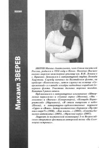 поэзия со ш Q. ш СО М Ц S со X S ЗВЕРЕВ Михаил Анатольевич, член Союза писателей России, родился в 1956 году в Пензе. Окончил Высшее военно-морское инженерное училище им. В.И. Ленина в г. Пушкине. Занимался в литературной студии Леонида Хаустова. Службу начинал на Балтийском флоте, на крейсере «Комсомолец»-, затем служил на эсминце «Со­ временный» и в штабе эскадры надводных кораблей Се­ верного флота. Участник дальних морских походов. Капитан 2 ранга запаса. Публиковался в литературных альманахах «Штор­ мовые параллели» и « Сияние лиры» (Москва), «Мы - земляки» и «Ваенга» (Североморск), «Площадь Перво­ учителей» (Мурманск), «Я стихи выпускаю в небо» (Пенза), в литературно-художественных журнала «Сура» и «Воин». Автор поэтических сборников «Ну что они о море?!» (1998), «Как жизнь...» (2002), «Советы бы­ валого автопоэта» (2005), «Мужские игры» (2007). Лауреат (в поэтической номинации) 3-го Всероссий­ ского открытого фестиваля авторской песни «На Соло­ вецких островах».