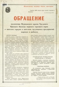 Мурманский морской торговый порт. Обращение коллектива Мурманского ордена Трудового Красного Знамени морского торгового порта к жителям городов и поселков, трудящимся предприятий, морякам и рыбакам / Мурм. мор. торговый порт, Всерос. о-во охраны природы. - [Мурманск : б. и.], 1979. - 1 л. ; 60х42 см. - (Кольскому заливу – быть чистым!).