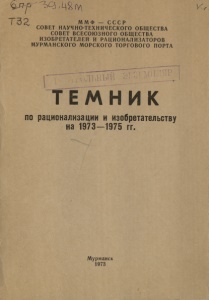 Темник по рационализации и изобретательству на 1973-1975 гг. / Совет науч.-техн. о-ва, Совет Всесоюз. о-ва изобретателей и рационализаторов Мурм. мор. торгового порта. – Мурманск : [б. и.], 1973. - 24, [1] с.