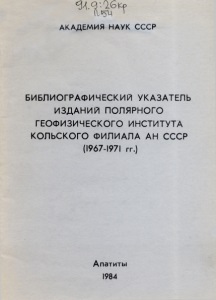 Библиографический указатель изданий Полярного геофизического института Кольского филиала АН СССР (1967-1971) / Акад. наук СССР, Кол. фил. им. С. М. Кирова, Науч. б-ка ; [сост.: Л. М. Брюнелли]. – Апатиты : Кольский филиал АН СССР, 1984. - 38 с.