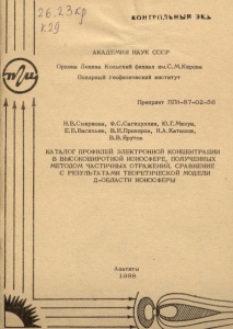 Каталог профилей электронной концентрации в высокоширотной ионосфере, полученных методом частичных отражений. Сравнение с результатами теоретической модели Д-области ионосферы / Н. В. Смирнова [и др.] ; Акад. наук СССР, Кол. фил. им. С. М. Кирова, Поляр. геофиз. ин-т. – Препр. ПГИ-87-02-56. - Апатиты : Кольский филиал АН СССР, 1988. - 30 с. : ил.
