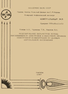 Осепян, А. П. Моделирование параметров потока высыпающихся электронов и высотного профиля электронной концентрации по данным аврорального поглощения / Осепян А. П., Чурикова Т. В., Власков В. А. ; АН СССР, Кол. фил. им. С. М. Кирова, Поляр. геофиз. ин-т.- Препр. ПГИ 86-11-53. – Апатиты : [б. и.], 1987. - 28 с.