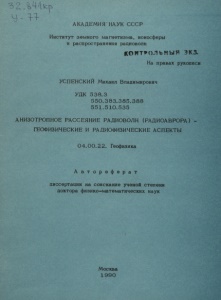 Успенский, М. В. Анизотропное рассеяние радиоволн (радиоаврора) – геофизические и радиофизические аспекты : автореферат диссертации на соискание ученой степени доктора физико-математических наук / Успенский М. В. – Москва, 1990. – 30 с.