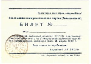 Билет № [пригласительный на IV Кировскую районную партийную конференцию, 28 марта 1942 г.] [Изоматериал: электронный ресурс] / Кировский РК ВКП(б). – Электрон. дан. (1 цв. файл : 0,12 МБ). – (Мурманск: Мурманская государственная областная универсальная научная библиотека, 2014). – Режим доступа: http://www.kolanord.ru. – Загл. с экрана. – Место хранения оригинала: Мурманский областной краеведческий музей.