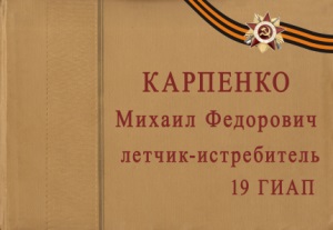 Карпенко Михаил Федорович, лётчик-истребитель 19-й ГИАП [Изоматериал : электронный ресурс] : [фотоальбом] / материал собр.: Зимин Юра и др. ; восьмилет. шк. пос. Килп-Явр Мурм. обл. – Электрон. дан. (1 файл : МБ). – (Мурманск : Мурманская государственная областная универсальная научная библиотека, 2015). – Режим доступа: http://www.kolanord.ru. – Загл. с экрана. – Место хранения оригинала: средняя школа пос. Килп-Явр Мурманской области.