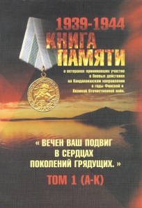 Крячков, А. Л. Вечен Ваш подвиг в сердцах поколений грядущих : (Книга Памяти о ветеранах 19-й армии, принимавших участие в боевых действиях на Кандалакшском направлении в годы Финской и Великой Отечественной войн, [1939-1944]) / Крячков Александр. - [Москва] : Международный общественный фонд "Российский фонд мира", 2014. - Т. 1 : А - К. - 240 с. : ил., портр.