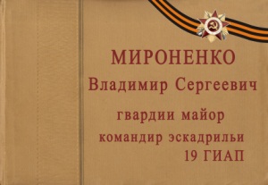 Мироненко Владимир Сергеевич, гвардии майор командир эскадрильи 19 ГИАП [Изоматериал : электронный ресурс] : [фотоальбом] / материал собр. и оформ.: Кабиков Юрий и др. ; восьмилет. шк. пос. Килп-Явр Мурм. обл. – Электрон. дан. (1 файл : 6,66 МБ). – (Мурманск : Мурманская государственная областная универсальная научная библиотека, 2015). – Режим доступа: http://www.kolanord.ru. – Загл. с экрана. – Место хранения оригинала: средняя школа пос.