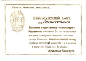 Пригласительный билет [тов. М. И. Старостина на торжественное заседание в Клубе пос. Мурмаши, посвященное вручению лучшим людям Колэнерго правительственных наград, 8 января 1944 г. Изоматериал: электронный ресурс]. – Электрон. дан. (1 цв. файл : 0,06 МБ). – (Мурманск: Мурманская государственная областная универсальная научная библиотека, 2014). – Режим доступа: http://www.kolanord.ru. – Загл. с экрана. – Место хранения оригинала: Мурманский областной краеведческий музей.