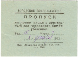 Пропуск на право входа в зрительный зал городского бомбоубежища : 5 дек. 1942 г. [Изоматериал: электронный ресурс] / [Мурманское] городское бомбоубежище. – Электрон. дан. (1 цв. файл : 0,07 МБ). – (Мурманск: Мурманская государственная областная универсальная научная библиотека, 2014). – Режим доступа: http://www.kolanord.ru. – Загл. с экрана. – Место хранения оригинала: Мурманский областной краеведческий музей.