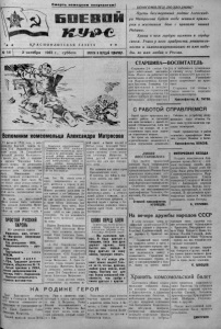 КОМСОМОЛЕЦ-ПОДВОДНИК! Пусть бессмертный подвиг Александ ра Матросова будет тебе живым приме ром в жестоком бою с врагами нашей Родины. Храни о нем гордую память в сердце своем. Учись у него храбрости, решитель ности и самопожертвованию во имя побе ды, во имя любви к России. СТАРШИНА—ВОСПИТАТЕЛЬ ТОВАРИЩУ. Вспомним комсомольца Александра Матросова ЛИНИЯ ВОССТАНОВЛЕНА При налете вражеской авиации была повреждена линия связи. Группе элек триков мичманаМитина было приказано немедленно уст ранить повреждение. Крас нофлотцы, вышедшие на ли нию, быстро восстановили ее. Особенно хороіпо пора ботали на восстановлении краснофлотцы Тельман, Ни- карский, Саламатов и Шад рин. С т а рш и й к р а с н о ф л о т е ц К У З Н Е Ц О В . ИНТЕРЕСНАЯ БЕСЕДА Ha-днях комсомолец Аве ринцев провел беседу с лич ным составом своего под разделения. Темой этой бе седы была речь Верховного Главнокомандующего Мар шала Советского Союза товарища Сталина от ё июля 1941 г. Аверинцев хорошо подготовился. Беседа полу чилась интересной и ожив ленной, В заключение крас нофлотцы просили почаще проводить такие беседы. А . К У Р И Н О К . На вечере дружбы народов СССР В клубе состоялся ветер, ;по- свяіценігыій дружбе народов О'ССР. Выступали рядовые и старшины. Подводник Краснознаменной лод ки украинец т. Кривонос зая вил: — Украинский народ третий год сражается плечом к плечу с другими братскими народами про тив немецких захватчиков за свою национальную свободу и независимость. Украинские па триоты показывают героизм, от вагу и самопожертвование в борь бе. Одним из многих ярких примеров этому является под виг комсомольцев подпольщиков г. Краснодопа. Бесстрашные под виги Олега Кошевого, Ивана Зем- нухова, Ульяны Громовой, Любо ви Шевцовой и Ивана Туркевича — пример для нас, товарищи ком сомольцы под-водники. Мы воины— русские, украин цы. белоруссы и других наций— на правом фланге великого фрон та будем мстить проклятым нем цам за кровь наших земляков. К . Ш В Е Ц О В Хранить комсомольский билет Состоялось общее комсо мольское собрание базы, на котором стоял вопрос о бдительности в хранении комсомольских билетов. С небольшим докладом вы ступил младший лейтенант тов. Большаков. Комсомоль цы обсудили вопросы, затронутые докладчиком, j вскрыли отдельные факты I неаккуратного и небреж ного хранения комсомоль ских билетов. I Іа собрании выступили старшие красно флотцы Савина, Косьмин, краснофлотцы Краснорамен- ский, Шабанов, Подхому- това и другие. После выступлений ком сомольцами была принята резолюция. ДМИТРИЕВ, Стерть немецким оккупантам! | J )luP0 Башкирского U'f'u и '^ов,ПІФКом Башкирской' ‘ " приняли специальное по* ^вовде-ние об увековечении па- 1(111 Герои Советского Союза аядра, Матрос ова. ней мужской школе Mi (i t обкома гор. Уфы и уфимскому парку культуры) и отдыха присваивает ся имя А. Матросова. Улица Я'налиф переименовывается в улицу имеиц А, Матросова. Имя героя будет месить также дет ский кинотеатр, который создает ся в Уфе. Управлению по делам искусств поручено привлечь скульпторов к разработке эскиза бюста А. Ма тросова, а Союзу писателей — издать массовым тиражом брошю ру о Матросове на русском и башкирском языках. Старшина 2-й статьи Си- дун заботливый воспита тель, Много он работает но воспитанию и обучению юн- гов Мирошниченко, Козло ва'и Хрулева. Товарищ Си- дун прилежный и аккурат н