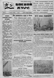 Смерть немецким оккупантам! БОЕВОЙ К Р А С Н О Ф Л О Т С К А Я Г А З Е Т А ★ ★ Слава наступающим частям Красной Армии, которые, пре­ следуя германские армии и со­ юзные с ними румынские войска, перешли на нескольких участках реку Прут и вступили на ру­ мынскую территориюХ ПОТОПЛЕН СТОРОЖЕВОЙ КОРАБЛЬ ПРОТИВНИКА Только недавно «малютка» пришла в базу, потопив круп* ный немецкий транспорт, и вот она уже снова в море — ищет врага. Накануне похода экипаж присутствовал на митинге, по* священном выходу Красной Ар' мни на государственную грани* цу СССР. В кубрик вернулись в приподнятом, радостном на* строении. Общее чувство выра­ зил парторг. Он сказал: — Армия наша к границе подошла. Великое дело! В та­ кие дни без победы нельзя воз­ вращаться. И энипаж славной «малют­ ки», имевшей уже на своем счету пять побед, добыл в этом походе шестую. Вражеский конвой обнаружил главный старшина Потапин. Он насчитал 18 вражеских кораб­ лей. Атаковать врага при столь сильном охранении— дело боль­ шого искусства, высокого воин­ ского мастерства. Но команди­ ру, бывалому, опытному под- воднику, удалось решить эту сложную задачу. Ему по­ могли в этом мотористы Ново­ жилов и Махов, торпедисты Ро­ дин и Ткач, помог весь экипаж. В отсеках услышали два оглушительных взрыва, а стар­ ший лейтенант Капитонов и главный старшина Потапин увидели, как один из стороже­ вых кораблей, охранявших кон­ вой, стал, об’ятый пламенем, погружаться в воду. Враг начал преследовать лодку, но ее командир умело оторвался от погони. Ему уда­ лось даже приподнять пери­ скоп, чтобы убедиться в резуль­ тате торпедной атаки. Одержав шестую свою побе' ду, «малютка» с победным са­ лютом возвратилась к родным берегам. На ремонте—как в бою План обеспечивает успех У о ш х ремонта зависит во мно­ гом от умелой организации труда, правильной расстановки людей. Помня об этом, я планирую все работы, веду им строгий учет. Когда заканчивается трудовой день, я бсседую с командиром от­ деления, узнаю, что проделано, ка­ кие остались недораіботки. Затем иду в мастерские, куда сданы за.- «азы на детали, и те, что готовы, забираю. После этого не состав­ ляет особого труда набросать ги ан на, следующий день. В плане я определяю, 'кто какую работу дол­ жен выполнить. Утром командир отделения знакомит с этим планом всех мотористов, прітнимаюапих участие в ремонте. Разрабатывая план, я особое снимание обращаю на. то, чтобы каждое задание поіручалось тому, кто в силах его выполнить. Так , например, когда нужпо было тща­ тельно осмотреть клапана одного из трубопроводов, я поручил эту важную и кропотливую раооту от­ личному специалисту старшему краснофлотцу Лебедеву, зная, что он с нею справится. А протирку и проточку клапанов солярных ма­ гистралей я дал старшему красно­ флотцу Бубнову, которому уже приходилось прежде выполнять подобные работы. От своих подчиненных я тре­ бую, чтобы онн перед тем. как приступить к той или иной рабо­ те, тщательно проверили и подго­ товили весь необходимый инстру­ мент. Это обеспечивает большую экономию времени — людям не надо лишний раз вылезать из от­ сека в поисках молотка или зуби­ ла. В конце каждой декады я под­ вожу итоги проделанного и соби­ раю гр упп у. Мотористы обсужідают ход работы, вскрывают недостат­ ки, предлагают .меры для их устранения. Мичман Ю. ЕЛИН. МСТИ НЕМЦУ, ПОДВОДНИК! П