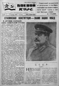 Смерть немецким оккупантам Советский патриоти зм не разъединяет, а наоборот, сплачивает все нации и народ ности нашей страны в еди ную братскую семью. И. СТАЛИН. 5 декабря 1944 г., вторник СТАЛИНСКАЯ КОНСТИТУЦИЯ— ЗНАМЯ НАШИХ ПОБЕД В ДРУЖБЕ НАРОДОВ— 1 „ СИЛА СОВЕТСКОЙ СТРАНЫ Я Н І В Н Н Н Н Н І Сталинская Конституция за крепила в законодательном поряд ке величайшие завоевания наше го народа, узаконила в нашей стране социалистический строй. Многонациональное советское государство, созданное волей всех народов, населяющих нашу стра ну,,і прошло и выдержало все ис пытания, и его прочности может позавидовать любое национальное государство в любой части света. «Социалистический строй, порож денный Октябрьской революцией, Дал нашему народу и нашей ар мии великую и непреоборимую силу». (И. Сталин). Крепкий союз народов СССР — эт«>дело всех советских народов 'главе со своим старшим бра том I— русским народом, іВ том и особенность нашего еоциалисти- дце советского патриота, живет желание беззаветно сражаться за честіь и свободу своей любимой Родины. Мы отмечаем День Сталинской Конституции в период торжества нашего дела, в период, когда и на нашей улице наступил празд ник, когда вся советская -земля очищейа от немецно-фашистских захватчиков. Сейчас стоит зада ча — довершить вместе с армия ми наших союзников дело раз грома немецко-фашистской ар мии, добить фашистского зверя в сге собственном логове И водру зить над Берлином знамя победы. Под знаменем Сталинской Консти- туцм)и, ведомые великим Сталиным, мы пойдем впервй к окончательной победе! н С С С Р (Справка) а I Всесоюзном с езде Советов, за слушавшем доклад товарища Сталина, 30 декабря 1922 года были приняты декларация и договор об образовании Союза Советских Социалистических Республик. Первыми учредителями и участниками СССР были РСФСР. УССР, БССР и ЗСФСР. В состав СССР впоследствии вошли на правах союзных республик: в 1925 году — Узбекская и Туркмен ская ССР, а в 1929 году — Таджикская ССР. Та ким образом до принятия Сталинской Конституции в Союз входили 7 союзных республик. После принятия Сталинской Конституции и на ее основе Казахская и Киргизская республики били преобразованы в союзные республики, а Гру зинская, Армянская и Д~'рбайджаяская ССР, в евши с ликвидацией З ^ в к а з с к о й федерации (ЗСФСР), вошли непосредственно в Союз как союзные республики. Таким образом к этому вре мени Союз об’единил уже 11 союзных республик. После краха белофшекой авантюры и заключе ния мирного договора с Финляндией (12 марта 1940 года) в состав Карельской автономной рес публики была включена территория, отошедшая от Финляндии, а сама Карельская АССР преобразо вана в союзную Карело-Финскую республику. Далее, в результате освобождения Бессарабии и Северной Буковины из-под пиеТа румынских бо яр, была образована Молдавская союзная респуб лика с включением в нее территории бывшей Мол давской автономной республики в пределах УССР, Согласно волеиз’явлеиию народов Литвы, Лат вии и Эстонии в августе 1940 года в СССР были приняты Литовская ССР, Латвийская ССР и Эс тонская ССР. Советский Союз стал об’единением 16 союзных республик. ■