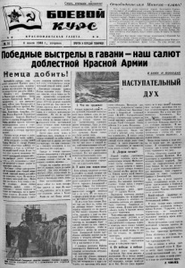 ^ • н д у ю щ н й Северным флотом адмирал- Головко поздрав- « экипаж подводной лодки Н. с потеплением трех кораблей Б П Е В П И Освободите.г/і.ѵ М инска — слава ! Как только по радио передали приказ Верховного Г л а в н о командующего об освобождении столицы Белоруссии города Минск, офицеры, старшины и краснофлотцы собрались у памятника героям- подводникам. Герой Советского Союза капитан 1-го ранга Колышкии открывает, митинг. Первое слово предоставляется капитану 2-го ран га Петрову. Затем выступают старшина 1-й статьи Баранцев, красно флотец Галактионов и др., старший краснофлотец Герасимович сказал: — Товарищи! Я житель Минска. Моя семья три года томилась под игом немцев, и я не знаю ее суд ьбы . Как же мне передать ра дость, где найти такие слова, чтобы отблагодарить Красную Армию, вызволившую мой родной город. Спасибо тебе, Красная Армия. Н а шим ответом на твои подвиги будут новые удары по врагу на Б ар е н цевом море. На митинге был принят текст письма подводников к Красной Ар мии. Зачитал письмо гвардии мичман Семенов. Долго несмолкаемое „ура!" и возгласы „Освободителям М и н с к а— слава" заглушали последнюю фразу чтеца. На этом митинг з а к рылся. Победные выстрелы в гавани- наш салют доблестной Красной Армии 4 июля 1944 г., вторник ПРОЧТИ И ПЕРЕДАЙ ТОВАРИЩУ. Немца добить! Величайшие п^оеды, одну за. другой одерживает Красная армия 8 свое* стремительном, всесокру шающем наступлении на врага в этиисторические дни лета 1944 г. .Ноталіось под Ленинградом, яа Карельском .перешейке. Затем заговорил Карельский фронт. И одновременно с. .ним двинулись вперед войска трех Белорусских п Іто Прибалтийского фронтов. Вы борг, Витебск, .Могилев, Жлобин, Ора, Осиповичи, Бобруйск, сто лица Карело-Финской Республики Петрозаводск, Борисов, Вилейка,*» Красное и столица Белоруссии — Мияок, десятки городов, крупных железнодорожных узлов и стан ций, сотни населенных пунктов освобождены в течение короткого времени. Огромны потери немцев в людях и технике, велики маши трофеи, Почти ежедневно столица нашей Родаы Москва от вмени Родины салютует доблестным войскам, от личившимся в боях за освобожде ние родной нашей земли. И как бы эхом этих салютов раздаются над далекой заполярной таванью побед ные выстрелы наших подводных лодок — это, возвращаясь с моря; GВДи рапортуют о новых ударах по вражеским конвоям. На Севере сейчас круглосуточ ной полярный день. Самый невы- годный, тяжелый период для дейст вия подводных лодок. Но мы неда ром воюем четвертый год. Наши люди научились бить немца в лю- » к условиях. Летом боевая активность наших лодок по ''Ійвнению/С зимним периодом не только не снизилась, но и значи тельно возросла. Недавние, боевые операции свидетельствуют о высо ком воинском мастерстве экипа жей лодок,'сочетающемся с исклю чительной отвагой наших людей. Блестящую операцию провела Н-ская подводная лодка. Немцы, как известно, стали теперь на Се вере чрезвычайно осторожными: 2— 3 их транспорта ходят в охра нении 10— 15 военных кораблей. Так и на этот раз. Два тяжело гру женых парохода шли в охранении 10 тральщиков, сторожевиков, ка теров, и с воздуха прикрывались самолетами. ІІо это не смутил.) Североморских подводников. Они смело пошли на прорыв конвоя и ці результате точно рассчитанной атаки потопили одним торпедным залпом три вражеских корабля: транспорт, сторожевик, тра