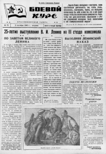 За нашу Советскую Родину! Б О Е В О Й ★ * К Р А С Н О Ф Л О Т С К А Я Г А З Е Т А ★ ★ № 75 2 октября 1945 г., вторник ПРОЧТИ И ПЕРЕДАЙ ТОВАРИЩУ. ★ ★ ПО ЗАВЕТАМ ВЕЛИКОГО Л ЕНИНА 25 лет назад, 2 октября 1920 1страны стала учиться коммуниз- года, в Москве проходил I I I Всероссийский С’езд Российско го Коммунистического Союза мо ■лодежи.. Это было в самый раз- мар гражданской войны. Моло дая советская республика вела неравную борьбу с многочислен ными. хорошо вооруженными ин тервентами и белогвардейцами. Орана была истощена, хозяй ство ее разрушено. В этот труд ный момент отовсюду на с’ езд в Москву собрались делегаты ком мунистического Союза молодежи, насчитывавшего тогда 400.000 членов. На нервом заседании с’езда, вечером 2 октября, выступил Владимир Ильич Ленин. Его .іс- ѵорическая речь явилась неожи данностью для молодежи. В то время, когда страна, измученная голодом и разрухой, переживала серьезную военную опасность, гениальный вождь рабочего клас са и большевистской партии, создатель первого в мире госу дарства рабочих и крестьян, по ставил перед союзом молодежи основную задачу: учиться. Ве ликий Ленин видел в этом залог построения коммунистического общества. «Только преобразуя коренным образом дело учения, организацию и воспитание моло дежи. мы сможем достигнуть то го, чтобы результатом усилий молодого поколения было созда ние общества, не похожего на старое, т. е. коммунистического общества». (Ленин). Владимир Ильич указал: чему учиться и ка к учиться. Он ска зал, что нужно учиться комму низму не только но книгам, но и и работе, в борьбе. «Без работы, без борьбы книжное знание ком мунизма из коммунистических брошюр и произведений ровно ничего не стоит, так к а к оно про должало бы старый разрыв меж ду теорией и практикой»... Вме сте с тем Ленин отметил огром ное значение теории: «Комму нистом стать можно лишь тогда, когда обогатишь свою намять знанием всех тех богатств, кото рые выработало человечество». Речь Владимира Ильича опре делила всю дальнейшую деятель ность комсомола. Выполняя за веты Ленина, молодежь нашей му, непосредственно участвуя в строительстве социалистического общества. После II I с’езда ком сомол послал тысячи своих чле нов в высшие учебные заведе ния, стал готовить десятки ты сяч специалистов для всех от раслей народного хозяйства. Сначала на восстановлении и реконструкции разрушенного войной Хозяйства, затем на ново стройках сталинских пятилеток комсомольцы показывают образ цы трудового героизма и .добле сти. Правительство наградило комсомол орденами Красного Знамени и Трудового Красного Знамени. За участие в Великой Отече ственной войне дважды ордено носный Ленинско-Сталинский комсомол награжден третьим ор деном — орденом Ленина. Комсомол под руководством большевистской партии воспиты вает молодежь нашей страны в духе коммунизма, так как учит этому Ленин, как учит это му товарищ Сталин. Миллио ны юношей и девушек становит ся активными строителями со циалистического общества, гото выми на любые подвиги для своей матери-Родины. «Мы хотим Россию из стра- чны нищей и убогой превра тить в страну богатую. И нуж но, чтобы Союз коммунисти ческой молодежи свое образо вание, свое учение и свое вос питание соединил с трудом ра бочих и крестьян, чтобы он не запирался в свои школы и не ограничивался лишь чтением коммунистических книг 