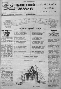 Смерть тттш м оккупантам! понедельник НОВОГОДНИМ ТОСТ Боевой счет подводников На пороге нового года За гнева высокого жажду, За ненависть, бьющую в грудь За армии нашей отважной Победами венчаний путь! За Родину снова и снова И с ней еще раз за одно За самое светлое слово- Победой, зовется оно! Традициям верные, встанем И, верные чувствам своим, За Сталина здравицу грянем И трижды ее повторим! Поднимем заздравные чаши , Как водится, выше голов. За вечную Родину нашу, За теплый отеческий кров. За отсветы радуг красивых, За теплые травы долин, Черемухи душную силу И красные грозди рябин. За то, чтоб весной голосили На всех лозняках соловьи. Поднимем, друзья, за Россию Мы первые чаши свои! Вторые поднимем за грозный, В веках небывалый поход. За алые, ратные звезды, Которые любит народ! Боевой счет потопленных севе роморскими подводниками немец ких кораблей открыла в 1944 году одна из «налиток», Б усло виях январской штормовой по годы и плохой видимости, она смело атаковала и пустила на дно крупный транспорт врага. Это был почин. Экипажи остальных подводных лодок, не остались в долгу. Вот вернулся корабль Щедрина, возвестив о потоплении фашистского танкера водоизмещением 10.000 тонн. Пришла еще ода «малютка», потопив транспорт Г>— 6 тысяч тонн водоизмещением. Ярогреме- ли в гавани орудийные выстрелы «Ярославского комсомольца» и «Челябинского комсомольца». Боевой счет рос неуклонно. Приближалось лето — самый тя желый период для действия под водных лодок. Яо летом северо морские подводники топили вра га еще успешнее, чем в полярную ночь. Так, блестящего успеха до бился капитан 2-го ранга Ту- рае®, уничтоживший одним тор педным залпом три вражеских корабля. Особенно отличились подводники в боях за Печешу. Был день, когда ів гавани разда лись один за другим 6 выстрелов в месть потопления 3 транс портов, танкера и 2 тральщиков. Всего за- время Неченгской опера ции враг потерял от ударов на ших подводных лодок 12 «ораб- лвй водоизмещением свыше 10 тысяч тонн. В 1944 году североморские подводники довели свой счет по топленных за войну немецких кораблей .до 244. Наши боевые дела получили высокую оценку советского на рода. Дважды упоминалось наше соединение в приказах Верхов ного Главнокомандующего Мар шала Советского Союза товарища Сталина. Бригада награждая» вслед за -орденом Красного Знаме ни орденом Ушакова 1-й ггдае- . яп. Орденом Красного Знамени награждены две подводные лодки Звание Героя Совете»ого С-»ю« присвоено командиру шшедивй лодки капитану 2-го ранга Г, И Щедрину. Сотни ®)дво,шwK.»fi в«- лучили боевые орден» и медали. Наступил 1945-й год. Какой славный боевой год, год замечательных побед, прожили ѵіьт. товарищи! В 1944 году свершилось то, о чем мечтал весь наш народ, ради него страна прошла через самые тяжелые испытания, ради: чего, Пролилась 'кровь лучших «сынов ! и дочерей Родины: священная ] советская земли освобождена от- | ліемецко-фашистской погани. Вот | он, праздник на нашей улице! К | нему привел нас великий і Сталин — наш вождь, отец и учитель. Победа завоевана наши- ) ми -доблестными армией и флотом | « жесточайших схватках с вра- j гом. Она завоевана всем совет ским пародом, свершившим в этой войне такие подвиги, кото рые стяжали ежу славу героиче ского народа. В боях за Родину неувядаемой славой покрыли «себя и моряки Северного флота. 'Тесно взаимо действу