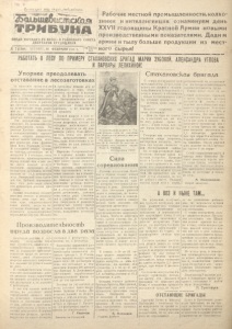 flf е м п ории е ш cttр еи , ш д и н а й т ш • г а я » 7 ъЩ ВШ ® т ' A T^rnqm vrnm ... о д ш ь и ю и о ю ^ I Рабочие местной промышленности, колхо зники и интеллигенция, ознаменуем день XXV II годовщины Красной Армии новыми производственными показателями. Дадим ОРГАН ТЕРСКОГО РК ВКП(б) И РАЙОННОГО СОВЕТА ^ . лг д е п у т а т о в т р у д я щ и х с я армии и тылу больше продукции из мест- М 7(1300)! ЧЕТВЕРГ , 15 ФЕВРАЛЯ 1945 г. Под изданий ; XIII ного сырья! РАБОТАТЬ В ЛЕСУ ПО ПРИМЕРУ СТАХАНОВСКИХ БРИГАД МАРИИ ЗУБОВОЙ, АЛЕКСАНДРА УГЛОВА И ВАРВАРЫ ЛЕПИХИНОЙ! Упорнее преодолевать отставание в лесозаготовках На последнее кремя н а ле созаготовках значительно улуч шилась массово-политическая работа. Пропагандисты рай- жома партии,уполномоченные Леспромкомбината с рабочи ми проводят беседы, доклады на политические темы, знако мят их со сводками Совин формбюро. На лесоучастках работает кинопередвижка. Эти мероприятия быстро сказались на повышении про изводительности труда. Иа участке Хлебное первенство в социалистическом соревно вании второго лесопункта, сейчас заняла бригада, кото рой руководит жена фронто вика Анна Ивановна Зубова. В последнюю декаду января ее бригада, .состоящая из 4 лесорубов и 2 возчиков,стала выполнять производственные нормы больше чем в два ра за. Здесь каждый лесоруб ежедневно заготовляет но 7 кубометров древесины, возчик вывозит по 11,5 кубометров леса. Январьскии план брига* дой тов. Зубовой неревыпол нен. Она дала сверх плана 108 кубометров деловой дре весины. Однако подлинных больше вистских темпов в лесозаго товках пока еще нет. Об этом ярко свидетельствуют такие факты, когда на ле соучастке Уккоозеро не вы полняются производственные нормы,но мастер тов. Мальцев н бригадиры никаких мер ие принимают к тому, чтобы усилить, заготовку и вывозку леса. На 10 февраля в целом по Деспромкомбипату irian первого квартала выполнен по заготовке только на 44,3 процента, а по вывозке на 42 процента. Первый квартал в ходе ле созаготовок является реша ющим кварталом, поэтому не обходимо мобилизовать все силы и средства на эту «алч нейшую работу. Надо добить ся того, чтобы вся рабочая сила, предусмотренная пла ном, была использована в ле су, чтобы ни одна лошадь не прогуливала, зря. Дирекция Леспромкомбина- та н партком должны шире развернуть массово-политиче скую работу среди лесорубов и возчиков. Надо охватить всех рабочих социалистиче ским соревнованием и неус танно помогать им в повыше нии производительности тру да, знакомя и обучая их ста хановским методам работы, решительно борясь с лодыря ми л дезорганизаторами тру довой дисциплины, умножая этим самым ряды стаханов цев и ударников лесозагото вок. Закреплять и развивать достигнутые успехи--такова задача каждого лесоруба, ма стера, начальника .лесопунк та. П р о и з в о д и т е л ь н о с т ь т р у д а в о з р о с л а в два р а з а Коллектив рабочих и слу жащих лесоучастка Верх ннй Ругору#п, включаясь в ооциадкстяческое соревнова нне за повышение производи тельности труда на лесозаго товках,. взял обязательство досрочно выполнить кварталь ное задание по рубке и вывоз ке леса. В социалистическом обяза тельстве было записано: довес тн дневную норму выработки на каждого лесоруба не менее •4,6 фестметров и но вывозке 7 фестметров.! О тех пор прошло меньше месяца, но результат этого соревнования сказался нали но. Благодаря повседневной