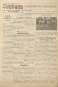 Пролетарии зсвх стран, соединяетесь! ; ОРГАН ТЕРСКОГО РК ВКП(б) И РАЙОННОГО СОВЕТА ДЕПУТАТОВ ТРУДЯЩИХСЯ Г 43 (1284' ! ЧЕТВЕРГ , 19 ОКТЯБРЯ 1944 г. , Красная Ярмия о д е рж а л а ещ е о дну крупную п о б е д у В о й с к а К трель J ского фронта, перейдя в наступление на Пет самском направлении , прорвали сильно укрепленную о б о р о н у немцев и при с од е й с т вии к о р а б л ей и д е с а н т ных частей Северног о Флота, о в л а д е ли в ажн о й военнО морской б а з о й и мощным опорным пунктом о б ор оны противника на крайнем с е в е р е г оро д ом Петсамо (Печенга) Честь и слава д о бл е с тным воинам Карельско го фронта и морякам Се Год издания XII ( в е рного Фло т а ! ЗАДАЧИ РАЙОННОЙ ОРГАНИЗАЦИИ ВЛКСМ Закончила свою работу IV* районная конференция ВЛКСМ .Подведены итоги за отчетный период. Выполняя указания товари ща Сталина комсомол под ру ководством районной партор ганизации проделал большую работу по оказанию помощи колхозам и предприятиям в разрешении хозяйственно—но .литических задач. Вместе с тем, на основе р а з вернутой большевистской кри тики и самокритики конферен ция вскрыла существенные не достатки в работе комсомоль ских организациях, ослаблена работа по идвйло-иолитичес- кому воспитанию комсомоль цев, ослаблена также работа Но приему в ряды ВЛКСМ. Обсудив проделанную рабо ту за отчетный период конфе ренция выдвинула перед рай онной комсомольской органи зацией ряд новых задач на ближайшее время. Конференция потребовала от всех сомсомольских орга низаций усилить контроль за выполнением решений XII пле нума ЦК. ВЛКСМ в деле ока зания еще большей помощи колхозам в разрешении всех хозяйственных задач этого го- года и в подготовке колхозов к весеннему севу и рыбной путине 1945 года. Конференция обязала но вый состав РК ВЛКСМ, сек ретарей первичных комсо мольских организаций улуч шить внутрисоюзную и орга- пизационную работу, добить ся регулярного проведения ’ омсомольских собраний,прев ратив их в подлинные шко лы политического воспитания комсомольцев и несоюзной мо лодежи. Первичные комсомоль ские организации дОлжны усилить работу но приему молодежи, решительно улуч шить работу по повышению (де.ино-полнтического уровня комсомольцев, шире развер .путь культурно-массовую и . воспитательную работу среди молодежи. Повседневно зани маться вопросами оказания помощи школе. Конференция потребовала от всех первичных комсомоль ских организаций улучшить качество военно-физкультур- лой работы. Полностью претворить в жизнь решения районной кон- фере нI[,ни ВЛКСМ —дол г и обязанность всех первичных ^комсомольских организаций НАВСТРЕЧУ XXVII ГОДОВЩИНЕ ОКТЯБРЯ В подарок Рабочие и работницы меха нического цеха Леспромкомби- ната, включаясь в предоктбрь- ское социалистическое сорев нование, брали обязательство повысить производительность труда на всех работах до 140 процентов за смену. Это слово они крепко держат. Кузнец Николай Алексеевич Лодкин, на изготовлении раз личных деталей для завода, сменные нормы выполняет на 200 процентов. празднику Работницы тт. Кононова, Кос тина и С'епчукова освоили спе циальности молотобойцев и сей час производственные нормы выполняют от 150 до 170 про центов. Коллектив рабочих и работ ниц механического цеха борет ся, чтобы ХХУП годовщину октяб} я ознаме! овать новыми по вы тонны ми проил водствен цыми успехами. м к а л а ч е в я . Обязате