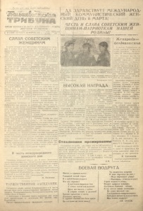 г / (Sir, c f t l' ettx crr f e r , соединяйтесь! SatbiujeBi' a&xm ОРГАН T IFCKC rO PI B i 'T (C) Y> РДГОЕКОГО СОВЕТА ДЕПУТАТОВ ТРУДЯ О МХСИ И 10 (1303^1 Ч Е Т В Е Р Г , 8 МЛРТЯ 1945 г. i Г ° Д^ Н1,Я СЛЯВН СОВЕТСКИМ ЖЕНЩИНАМ ДА ЗДРАВСТВУЕТ МЕЖДУНАРОД НЫЙ КОММУНИСТИЧГСКИЙ ЖЕН СКИЙ ДЕНЬ 5 /ПАРТА! ЧЕСТЬ И СЛАВА СОВЕТСКИМ Ж ЕН ЩИНА М-ПА ТРИОТКАМ НАШЕЙ РОДИНЫ! Б своем историческом док ладе G ноября 1944 года то варищ Сталин дал высокую опенку нашим славным совет ским женщинам в их героичес ком труде. Он говорил: „нав сегда войдут в историю бес смертные трудовые подвиги советских женщин и нашей славной молодежи, вынесших на своих плечах основную тя жесть труда на фабриках и заводах, в колхозах и совхо зах... “ Вместе с многомиллионной армией наших славных совет ских тружениц, не покладая рук, работают на дело быст рейшего разгрома фашистской Германии женщины и девуш ки нашего района. На лесоза воде, в лесу, в колхозах и подсобных хозяйствах они, за менив своих мужей, братьев и сестер, ушедших на фронт, показывают высокий иример дисциплины и трудового му жества. Стахановка лесозавода тов. Дубровская еще молодая ра ботница, но она быстро овла дела 'лрофессией олсктремонте ра и сейчас прекрасно сирав лястся с этой работой. При мер высокой производитель ности труда показывают иници аторн социалистического со ревнования среди лесорубов и возчиков второго лесопункта т.т. Зубова и Дёменкова. Их бригады ежедневно выполня ют производственные нормы не низко 180—200 процентов. От работниц не отстают и колхозницы. Всему району из вестна стахановка высоких уро жаев в колхозе „Всходы ком мунизма" Александра Забор- щикова, вырастившая в прош лом году 370 центнеров капус ты с гектара. Лучшие стаха новки этого колхоза т.т. Коно валова, Приданникова и дру гие на всех работах выпол няют производственные нормы но ниже 160 процентов. В кол хозе „Всходы коммунизма" насчитывается 40 стаханов цев, подавляющее болыпинст во их-женщины. Т акже честно и Самоотвер женно трудится наша славная советская интеллигенция, вое питанная большевистской пар тией, товарищем Сталиным. Только из трех учителей, наг ражденных орденами и меда лями по нашему району—-две женщины—это т.т. Чудинова и Инопина. Наши зк общины ire только отдают все свои силы на де ло лебеды, во и сами своей грудью защищают свободу и независимость нашей Родины. Партизанка — учительница тов, Краснолобова за боевые дела в партизанской борьбе против немецко•фашИстеких захватчиков награждена ме далью „За боевые заслуги". Санитарка тов. Горчакова на! ТГТ|1Г,ГХ матерой, поле битвы с врагом также) Орденами .Материнская отмечена правительственной слава1' второй степени яаграа; ■Жене» не ! . лггю-молодежиые Йрига.'ы угольного рудник® ,,Кок Я:: гак ' rhiipi шгкая ССР) систематически перевыполняю* нормы, давая уггль <верх плана в Особый фенд Главного Коман д «алия. Па снимке: Стах? ногкн-ксмес молки (слепа направо)—навалоот бойщик llafiaa Атабвеса и коногонм Тур* у и Карабаева и Ан ин Калнепа. Фото К. Вильчияской Фотохроника ТАСС ВЫСОКАЯ НАГРАДА 7 февраля Указом IIревидиу | Медалью „Мед* ль материн ма Верховного Совета РСФСР j ства“ 1 степени, --работая- 1 Ю Мурманской области наг ражд-ны орденами .Материи Ская слава" и медалями ,Мо даль материнства"—113 мно годетных матерей, среди них ПС:нашему району 10 много- наградой. Слава нашим женщинам— патриоткам! Товарищ Сталин нас учит тому*... что чем