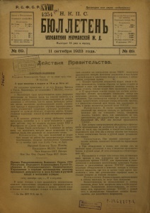 Р. С. Ф. С. Р. Ц ены в П е т р о г р а д е : Отдельного номера 25 к. П о д п и с к а : На 1 мес. . . 2 р. 50 к, . 3 „ . . 7 „ 50 „ 435 « Г ) Пролетарии всех стран, соединяйтесь ! н. к. п. с. О б ъ я в л е н и я : За 1 стр. . . . 50 р. ч* 30 20 В червонных рублях по курсу дня оплаты. БЮЛЛЕТЕНЬ УПРАВЛЕНИЙ МУРМАНСКОЙ Ж. Д. Выходит 12 р а з в месяц. №89. 11 октября 1923 года.* №89. \ г: ГгС \ иг,и*а*У'',А_ Действия I l--' : \ " ‘ т т л г < гр - л -т т Дравительства . ПОСТАНОВЛЕНИЕ 'к— Народного Комиссариата Труда от 19 июня 1923 года. № 275/779. О труде малолетних в возрасте от 14-ти до 16-ти лет. На основании примечания к ст. 135 Кодекса Законов о Труде, Наркомтруд, по соглашению с ВЦСПС , п о с т а н о в л я е т : 1. Инспекторам труда предоставляется право разрешать регистрацию ка биржах труда, где таковые имеются, а в остальных случаях— непосредственно направлять на работы, связанные с обучением, как-то: школы фабзавуча, район ные школы, мастерские, профтехнические школы, учениче ские бригады и индивидуальное обучение (кустарно-ремес ленное ученичество) следующие категории малолетних в возрасте от 14-ти до 16-ти лет: а) круглые сироты, б) един ственные кормильцы семьи и в) особо-материально-нуждаю- щиеся. i 2. В качестве учеников в школу фабзавуча помимо малолетних, указанных в п. I, могут посылаться и другие дети рабочих того же возраста, согласно правил НКТ и Наркомпроса от 5‘‘ июня 1923 года, № 252/767 х). 3. Биржа Труда регистрирует и направляет на работы лишь тех малолетних, которые имеют разрешение от ин спектора 'труда, или уволенных по сокращению штата. П р и м е ч а н и е . Ни один малолетний не может быть послан на работу без предварительного освиде тельствования, согласно постановления Совнаркома от 13 октября 1922 года (Собр. Уза»., ст. 842). Народный Комиссар Труда Шмидт. Председатель ВЦСПС Т о л ю к и й . Член Коллегии НКТ Каплун. Пом. Зав. Отд. Охраны Труда НКТ Хесин. Приказ Революционного Военного Совета ССС Республик, Народного Комиссариата Путей Со общения и Государственного Политического Управления о порядке производства поверки проездных документов и веса багажа и ручной клади в воинских поездах. 10/25 сентября 1923 г., Лг° 11263/2026. -В целях поверки в пути правильности использования воинских перевозочных документов и предупреждения и пресечения незаконного проезда и провоза ручной клади и багажа во всех воинских поездах и в специальных воин 1) См. Изв. НКТ № 21, стр. 11. ских составах— на контрольные органы НКПС возлагается производство поверки проездных документов и веса багажа и ручной клади в означенных поездах и составах, с соблю дением следующих правил: X. Поверка проездных документов и,'веса клади и ба гажа производится, главным образом, во время стоянки на станции и лишь при невозможности закончить поверку во время стоянки, таковая может быть продолжена и в пути. 2. О предстоящем осмотре поезда или состава, контро лирующие обязаны предупредить коменданта поезда или начальника эшелона, предъявляя при этом надлежащие документы. При производстве осмотра и проверки обязан также присутствовать комендант поезда, начальник эшелона, а в санпоездах— главный врач поезда, или заменяющие их лица, а также вызывается местный агент ТО ГП У . П р и м е ч а н и е . В случае возникновения недо разумений при контроле поездов, по требованию кон тролеров или же коменданта поезда, начальника эшелона, главного врача или заменяющих их лиц, приглашаются дл