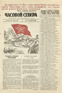 Да здравствует 1-е Мая класса! Пролетарии всех против немецко-фашистских захватчиков! СМЕРТЬ НЕМЕЦКИМ ОККУПАНТАМ! -день смотра боевых сил рабочего стран, соединяйтесь для борьбы ЧАСОВОЙ ( Ш И ЕЖЕДНЕВНАЯ КРАСНОАРМЕЙСКАЯ ГАЗЕТА 1 мая 1942 года, Пятница, №121 ПРОЧТИ И ПЕРЕДАЙ ТОВАРИЩУ ПРАЗДНИК ВЕСЕННЕГО НАСТУПЛЕНИЯ Не с цветами в руках встречаем мы день 1 Мая, не медь оркестров гремит под весенним небом — наши руки сжимают боевое оружие. Под первомайским солн­ цем гремит грохот битвы за родину. Воины Заполярья! Достойно встретим наш весен­ ний праздник — день смотра боевых сил рабочего класса и всех трудящихся! Пусть станет сегодняшний Первомай праздником нашего весеннего наступления, праздником боевой славы и нашей победы! Весь народ мобилизует сегодня свои силы на борь­ бу с заклятым врагом — кровавым немецким фашиз­ мом. Новые десятки и сотни орудий, танков, самоле­ тов, минометов и другого вооружения дадут фронту в день 1 М ая рабочие и работницы социалистической промышленности. Новые тысячи гектаров будут вспа­ ханы и засеяны на полях совхозов и колхозов. Новые золотые страницы впишут в историю отечественной войны славные воины Красной армии и Красного фло­ та, мужественные сыны и дочери родины — партизаны и партизанки. Смерть фашистскому чудовищу, смерть кровавой гидре фашизма! — вот главный лозунг, который напи­ сан сегодня на первомайских знаменах всего мира. Лучшие силы человечества сплотились под этим бое­ вым лозунгом. Героические защитники Севера! Несокрушимой ве- сенней лавиной рванемся вперед, очистим советское За- полярье от фашистской нечисти! Прочь с нашей земли, оккупант! Сдавайся, — иначе смерть! Сила теперь в наших руках. Только одна наша часть за один день предмайских наступательных боев истребила 350 немецких солдат н офицеров. С каждым часом растет количество боевых трофеев. Замолкают выведенные из строя славными артиллеристами и гор­ дыми сталинскими соколами пулеметы' и минометы врага. Один за другим оставляют фашисты свои огне­ вые рубежи под могучим натиском северных советских богатырей. На нашем первомайском знамени написано одно слово: «Вперед!». Вперед!.. И да здравствует I М ая — праздник на- шего наступления, праздник нашей славы, праздник нашей победы! БОЕВЫЕ ПОДАРКИ К 1 МАЯ Подразделения одной из наших частей, тесня противника, продвигаются вперед. В результате наступательных боев на 28 апреля они уничто­ жили 350 немецких солдат и офицероз, рассеяли до 5 взводов вражеской пехоты, разрушили 3 вражеских дзота, уничтожили 7 станковых пуле­ метов н 8 других огневых точек врага. ☆ ☆ ☆ Продолжая наступательные бои, подразделения Н-ской части уничтожили до 90 фашистов. Взяты пленные. В бою захвачены трофеи: 20 ящиков с минами и 272 мины, 10 ящиков патронов и 4 ты­ сячи патронов, 2 крупнокалиберных пулемета. ☆ ☆ ☆ Поддерживая наступление наземных войск, мощный удар по врагу наносят сталинские со к о ­ лы. Прикрывая наступающие подразделения, лет­ чики успешно бомбардировали артиллерию и ог­ невые точки противника, штурмовали вражескую пехоту. УНИЧТОЖЕНО 17 ПУЛЕМЕТОВ ВРАГА Ранним утром командир Филимонов со своими бойцами сосредоточился на исходном рубеже. В воздух взвилась ракета. Подразделение начало наступление и стремительной атакой овладело хребтом безымянной высоты. Немцы подтянули свежие силы. Завязал